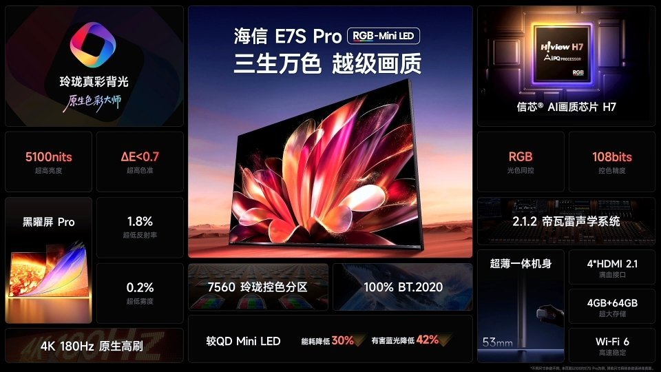 海信E7S Pro RGB-Mini LED 三原色直出 + 信芯H7独立画质芯片,7560玲珑控色分区、100% BT.2020色域,色彩准的像原画。黑曜屏Pro 1.8%超低反射率。原生4K 180Hz + ,4路满血HDMI2.1,游戏党丝滑爽玩。2.1.2帝瓦雷声学系统,53mm超薄一体。画质、游戏、音质、颜值一步到位。