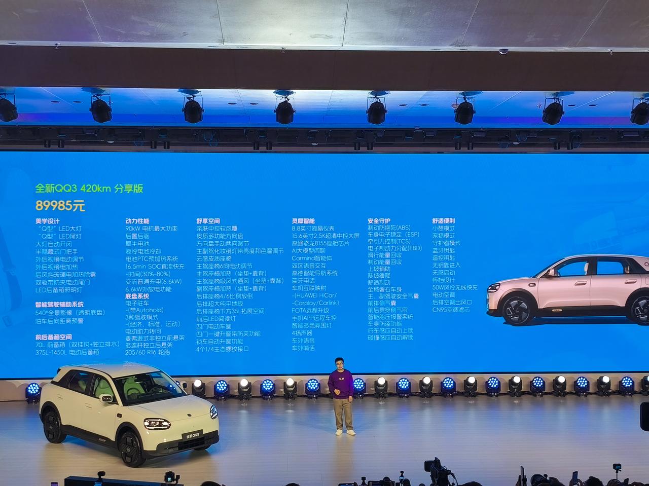车盟快讯:今日,奇瑞全新QQ3正式开启预售,预售价格 6.8920—8.9985 万元,多种配置限时送,下定1000元,再送1000元礼包券。 新车推出310km、420km两种续航版本,共四款车型。奇瑞全新QQ3主打家庭个性小车,采用后置后驱、四轮独立悬架设计,拥有2700mm轴距与70L 电动前备箱,配备4个生态拓展接口。车内搭载高通8155芯片、15.6英寸2.5K高清中控大屏,并配备猎鹰500智能驾驶辅助系统。QQ 作为中国微型车的经典代表,全新 QQ3 换代而来,这个预售价你觉得怎么样呢?