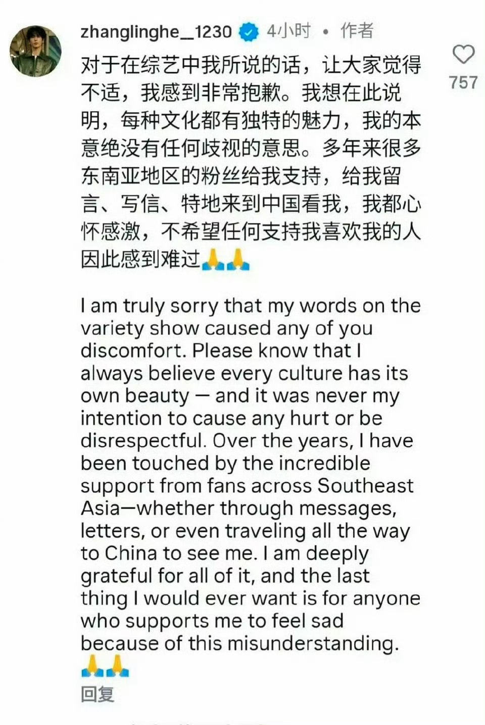 张凌赫因在综艺节目《你好星期六》中一句即兴调侃引发海外争议,于2026年3月10日通过Instagram发布中英双语道歉声明,强调"绝无歧视意图",但舆论对其言行动机与道歉诚意呈现显著分化。