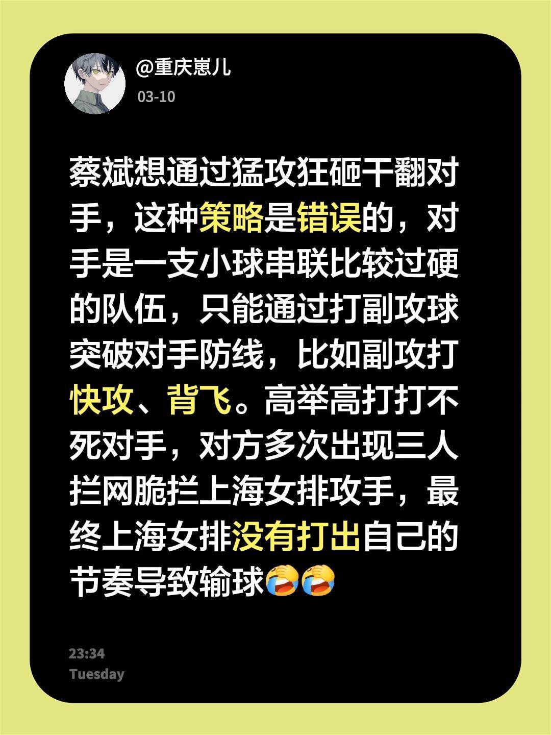 我评论了@重庆崽儿 的作品: 蔡斌想通过猛攻狂砸干翻对手,这种策略是错误的,对手是一支小球串联比较过硬的队伍,只能通过打副攻球突破对手防线,比如副攻打快攻、背飞。高举高打打不死对手,对方多次出现三人拦网脆拦上海女排攻手,最终上海女排没有打出自己的节奏导致输球。