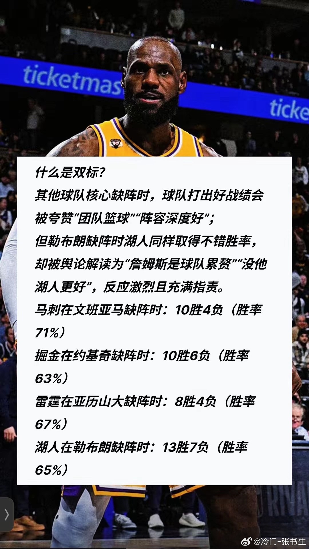 双标现象!!!詹姆斯算不算球队老大呢?同样都是缺阵,怎么评价就不一样了呢?这种双标太明显了。马刺没文班,10胜4负;掘金没约基奇,10胜6负;雷霆没SGA,8胜4负,大家都夸是“团队篮球”;可湖人没詹姆斯,13胜7负,大家却震惊又愤怒。同样都是核心缺阵,胜率还都超过65%,待遇却大不相同。前者被说“阵容强”,后者却被说“詹姆斯拖后腿”。这种双标,已经不是理性讨论了,而是带着偏见的发泄。当胜利被说成“核心没用”,篮球就变味了。nba湖人詹姆斯
