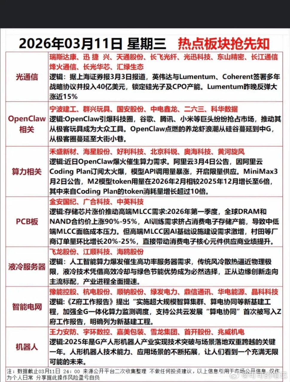 1.光通信2.OpenClaw3.算力租赁4.PCB板5.液冷服务器6.智能电网今日看盘