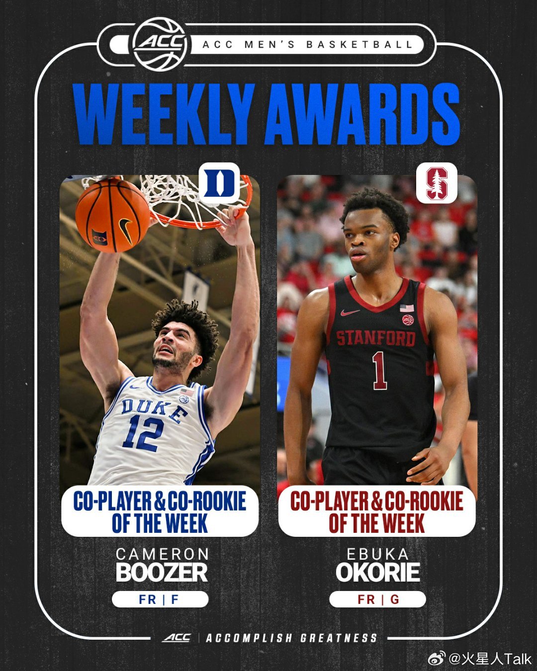 ACC联盟第18周表现奖(2025-2026赛季)。NCAA男篮最佳球员:Cameron Boozer、Ebuka Okorie,最佳新生:Cameron Boozer、Ebuka Okorie。