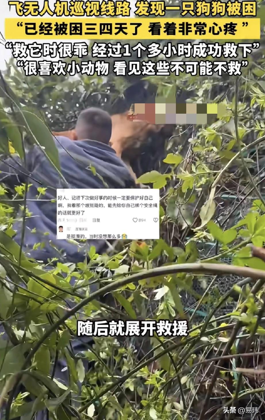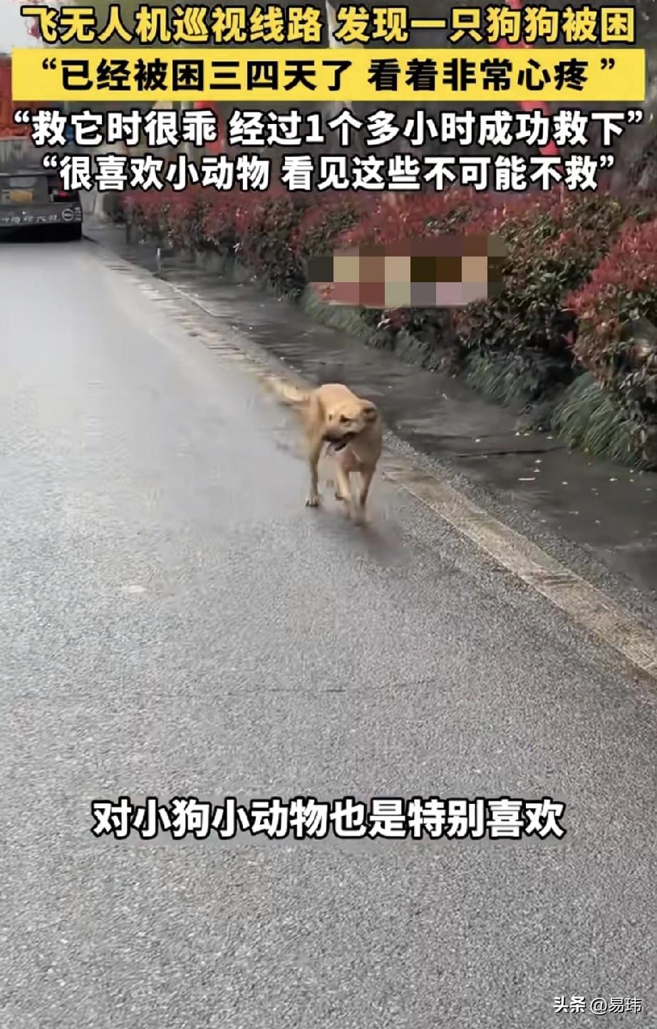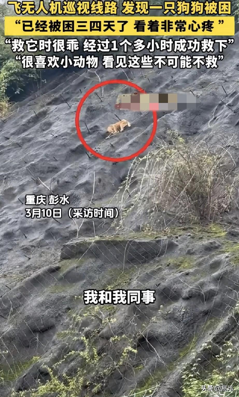 泪目了!这天一位大哥和同事一起去飞无人机巡视线路,结果发现一只可怜的狗狗被困在陡峭的山壁上,它不敢上也不敢下,看样子已经困了很久了,结果听路边的居民说已经困了三四天了。 善良的大哥从小就很喜欢小动物,这一幕令他顿时心生怜悯之心,于是决定救助它,随后便和同事展开了救援,他小心翼翼的往上爬,慢慢的靠近狗狗,在花费了一个小时的时间,大哥才救到了它,它很乖一直没有反抗。 这只狗狗也是很幸运的,虽然自己被困于险境。却遇到了这么善良的大哥,将它救了下来。为好心的大哥鼓掌!