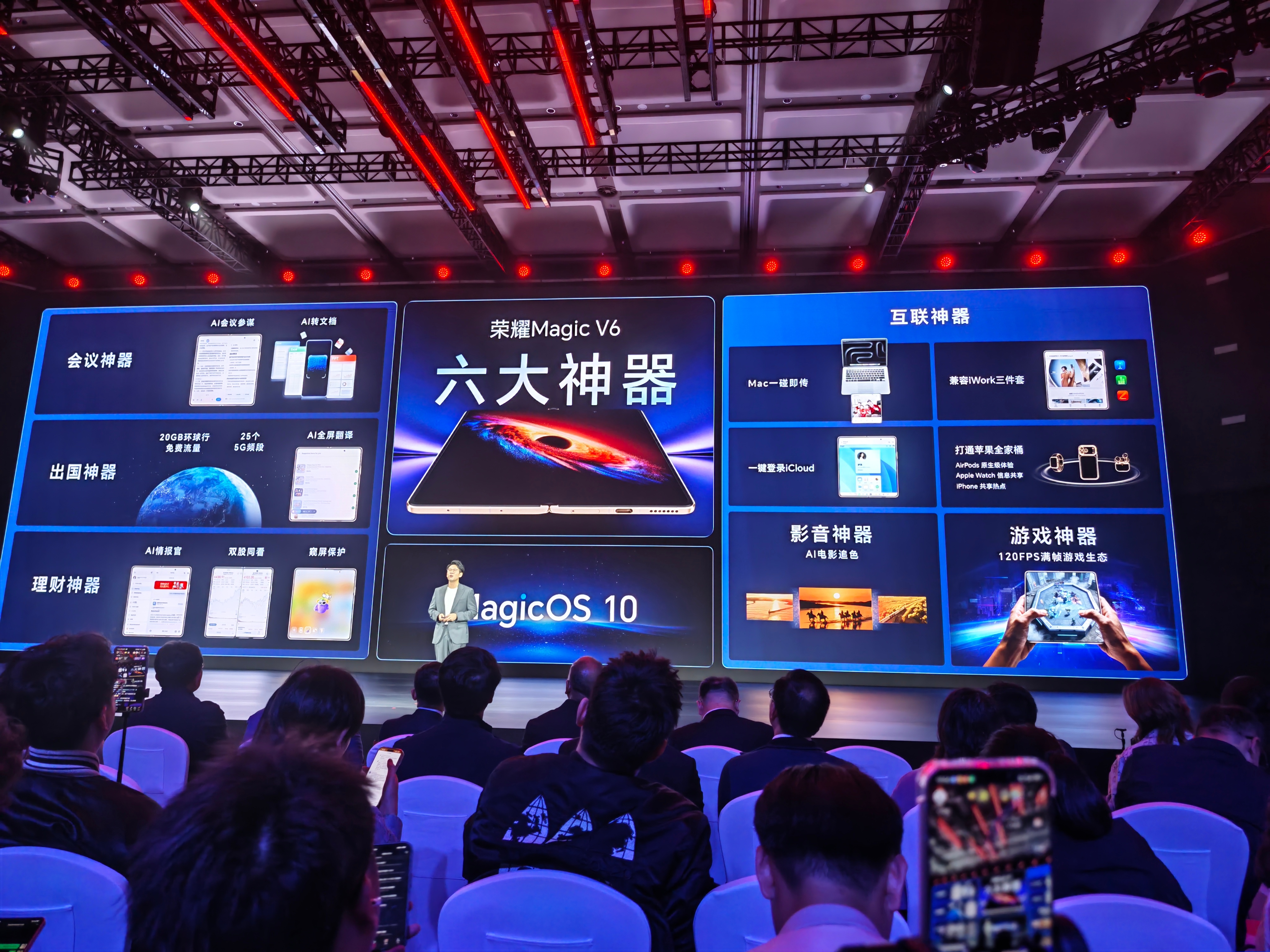 除了硬件层面的满配荣耀Magic V6这次还给大家带来了“六大神器”:会议神器(AI文字处理能力),出国神器(免费环球流量+AI翻译),理财神器(AI情报官+分屏交互体验+窥屏保护),互联神器(打通苹果全家桶互联),影像神器(AI电影追色),游戏神器(120帧满帧游戏生态)