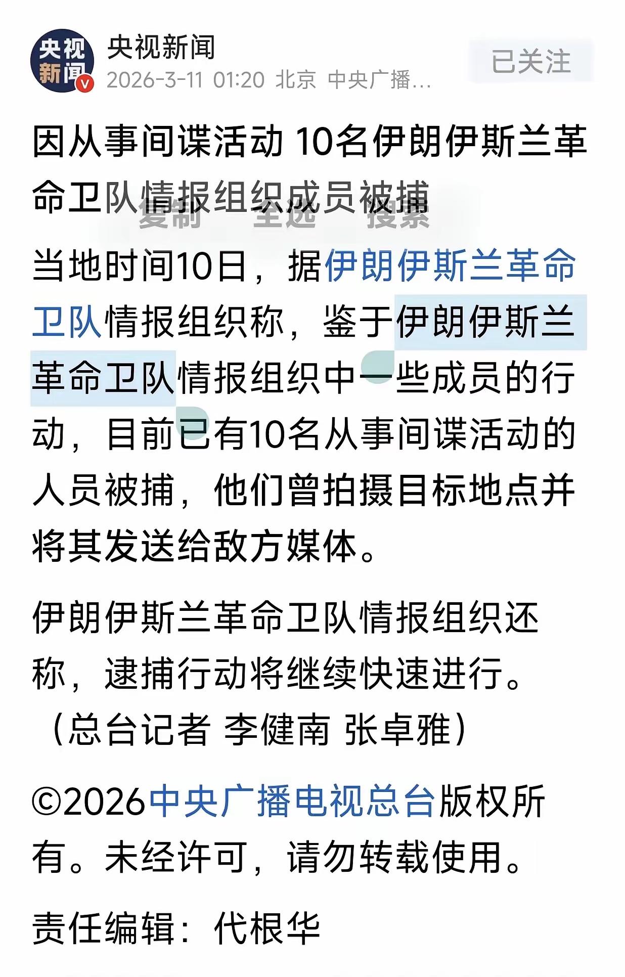 刚才从《央视新闻》获悉,伊朗伊斯兰革命卫队于10日清除10名“内鬼”。 这10名内鬼是卫队情报组织人员,他们曾把拍摄的伊方重要目标和地点发送给敌方媒体,造成伊方重大损失,卫队将其逮捕。 军内出吃里扒外的间谍,危害更大,必须彻底清除。 消息一出来,不少人都在感叹一句:这种事要是发生在军队内部,那影响真不是一般的大。军队本来就是最讲纪律、最讲保密的地方,一旦有人把情报往外递,那等于把自家的门钥匙直接交到别人手里。 从公开的信息来看,这几个人干的事其实很简单——拍照片、传消息。听起来像是很普通的动作,可放在军事系统里,这就是非常严重的泄密行为。很多重要设施、部署位置,一旦被外界摸清楚,后果往往是连锁反应。一个坐标、一张照片,有时候就能决定一场打击行动的成败。 也难怪伊朗方面这次处理得这么果断。情报系统里最怕的就是“内鬼”。外部侦察再厉害,很多核心东西也不一定摸得到;可要是内部有人主动往外送消息,那防起来就难多了。就像家里装再多锁,如果钥匙在别人手里,门再厚也不管用。 不少军事评论员也提到一个共同点——很多国家在安全体系里,最重视的就是内部审查。人员背景、信息权限、日常行为,都要反复核查。看着有点严格,其实就是防这种情况发生。 还有一点让人挺感慨的,这些人本身就在情报机构里工作,本来是负责保护秘密的人。结果角色一转,反倒成了泄密的源头。这种事情一旦曝光,带来的打击不只是安全层面,还有信任问题。 网上也有不少网友说得很直白:间谍不一定都藏在外面,有时候就混在身边。平时看着和普通人没两样,一旦事情败露,才发现问题早就埋下了。 从另一个角度看,这种清理行动其实也是一种警示。军队系统讲的就是底线和纪律,谁碰了这条线,基本没有回旋余地。对很多国家来说,保密和忠诚是最基本的要求,一旦出现吃里扒外的人,处理往往都会很严厉。 这类新闻之所以引起这么多关注,说白了还是因为大家都清楚一点——国家安全不是一句空话。很多看不见的地方,其实一直在较劲。外部压力也好,内部风险也好,一旦放松警惕,就可能被钻空子。 事情已经公开,后续怎么处理、有没有更多细节被披露,外界还在持续关注。能确定的一点是,这种“内鬼”一旦被揪出来,基本都会被连根清理。