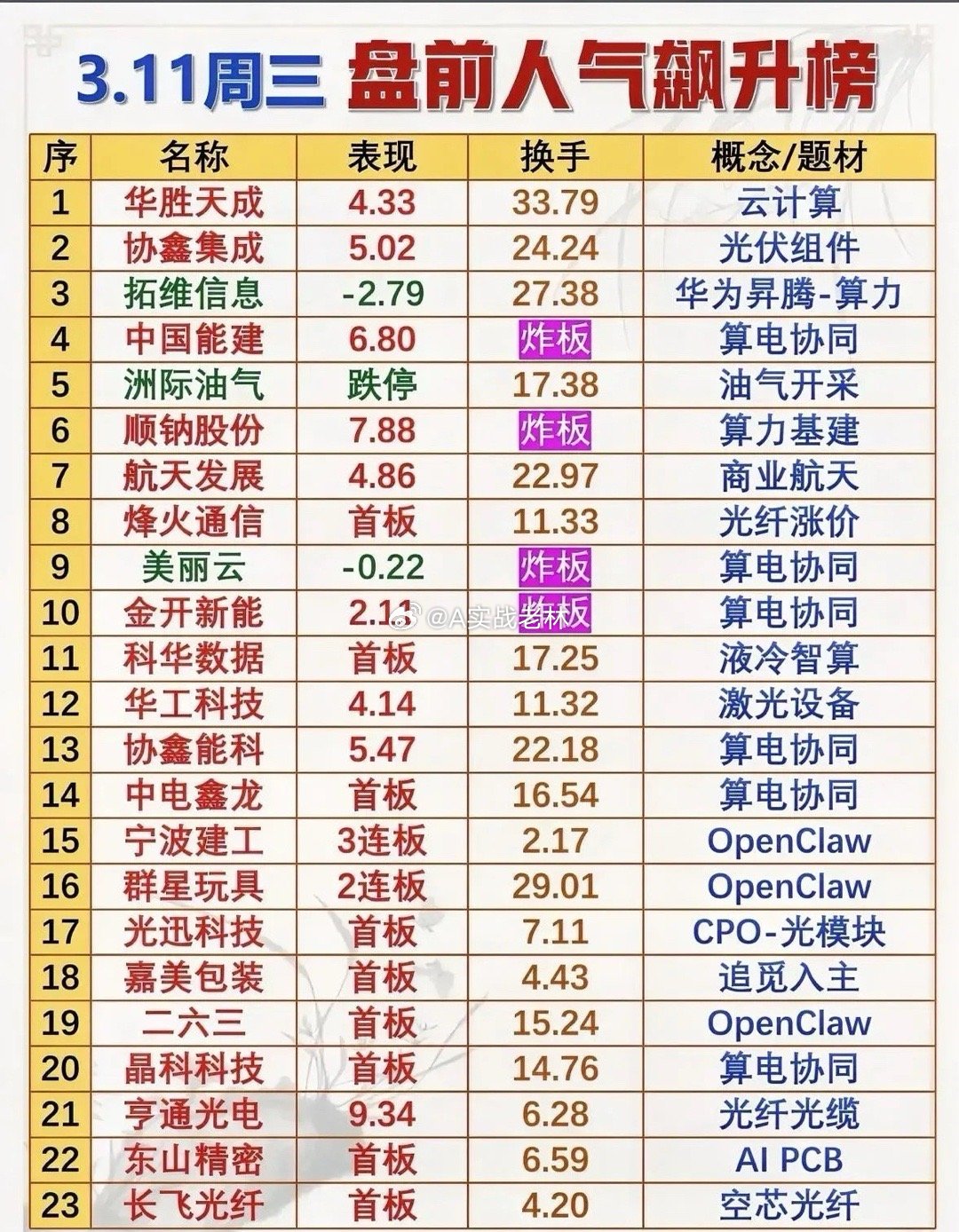 今日聚焦算电协同、算力、光通信等科技主线,叠加OpenClaw、空芯光纤等新题材,算电协同相关标的数量最多,同时商业航天、光伏等赛道亦有表现,整体呈现科技主线领衔、新题材受捧、传统板块弱势的特征。个股梳理分析1. 华胜天成:涨幅4.33%,换手33.79%,云计算概念。算力+云计算核心标的,高换手凸显资金活跃,云计算业务受益于数字经济需求,盘前人气靠前,短期资金关注度较高。2. 协鑫集成:涨幅5.02%,换手24.24%,光伏组件概念。光伏组件龙头,受益于光伏行业景气度回升,高换手体现资金博弈,光伏板块回暖下短期或维持震荡偏强走势。3. 拓维信息:涨幅-2.79%,换手27.38%,华为昇腾-算力概念。算力+华为昇腾核心标的,股价回调但换手仍高,算力板块短期分歧,资金仍博弈其AI算力业务的长期潜力。4. 中国能建:涨幅6.80%,炸板,算电协同概念。算电协同核心标的,炸板显示资金分歧,基建+算电业务双轮驱动,基本面稳健,盘前人气突出。5. 洲际油气:跌停,换手17.38%,油气开采概念。油气开采标的,受油价波动影响跌停,资金撤离明显,油气板块短期弱势,盘前人气因跌幅居前。6. 顺钠股份:涨幅7.88%,炸板,算力基建概念。算力基建标的,炸板体现资金分歧,电网+算力基建业务布局,高换手下短期或震荡整理。7. 航天发展:涨幅4.86%,换手22.97%,商业航天概念。商业航天核心标的,受益于产业政策利好,高换手显示资金活跃,短期或随板块维持强势。8. 烽火通信:首板,换手11.33%,光纤涨价概念。光通信龙头,光纤涨价利好业绩释放,首板体现资金做多意愿,光通信板块热度延续,短期走势偏强。9. 美丽云:涨幅-0.22%,炸板,算电协同概念。算电协同标的,炸板后股价微跌,算力+数据中心业务,资金分歧明显,短期或震荡调整。10. 金开新能:涨幅2.11%,炸板,算电协同概念。算电协同+新能源标的,炸板显示资金兑现意愿,新能源+算电业务双布局,短期或震荡整理。11. 科华数据:首板,换手17.25%,液冷智算概念。算电协同+液冷智算核心标的,首板体现资金做多,液冷智算需求旺盛,短期或延续强势走势。12. 华工科技:涨幅4.14%,换手11.32%,激光设备概念。激光设备+光模块双主线,受益于AI算力需求,资金持续布局,短期震荡偏强,技术面企稳。13. 协鑫能科:涨幅5.47%,换手22.18%,算电协同概念。算电协同+电力标的,高换手显示资金活跃,电力+算电业务拓展,短期或维持震荡上行。14. 中电鑫龙:首板,换手16.54%,算电协同概念。算电协同+安防标的,首板体现资金做多,算电业务布局,短期或跟随板块保持强势。15. 宁波建工:3连板,换手2.17%,OpenClaw概念。OpenClaw新题材标的,3连板显示资金追捧,基建+新题材双驱动,短期走势强势。16. 群星玩具:2连板,换手29.01%,OpenClaw概念。OpenClaw新题材标的,2连板+高换手,资金炒作新题材,短期或延续强势但波动较大。17. 光迅科技:首板,换手7.11%,CPO-光模块概念。CPO+光模块核心标的,受益于AI算力需求,首板体现资金做多,光通信板块热度下短期偏强。18. 嘉美包装:首板,换手4.43%,追觅入主概念。消费包装标的,受追觅入主消息刺激首板,事件驱动型行情,短期或随消息面波动。19. 二六三:首板,换手15.24%,OpenClaw概念。OpenClaw新题材标的,首板+高换手,资金炒作新题材,通信+新题材双布局,短期或震荡偏强。20. 晶科科技:首板,换手14.76%,算电协同概念。算电协同+光伏标的,首板体现资金做多,光伏+算电业务,短期或跟随板块强势。21. 亨通光电:涨幅9.34%,换手6.28%,光纤光缆概念。光纤光缆龙头,受益于光纤涨价,股价涨幅居前,光通信板块热度下短期或维持强势。22. 东山精密:首板,换手6.59%,AI PCB概念。AI PCB核心标的,受益于AI服务器需求,首板体现资金做多,消费电子+AI双轮驱动,短期偏强。23. 长飞光纤:首板,换手4.20%,空芯光纤概念。空芯光纤新题材+光纤龙头,首板体现资金追捧,空芯光纤技术突破利好,短期或随新题材强势。总结今日盘前人气榜以算电协同、算力、光通信等科技主线为核心,OpenClaw、空芯光纤等新题材获资金追捧,高换手标的居多,反映市场对热门赛道的高度关注。部分标的炸板、跌停体现资金博弈激烈,商业航天、光伏等赛道亦有表现,传统油气板块则明显弱势,资金整体向高成长科技赛道集中。本文涉及资讯、数据等内容来自网络公共信息,仅供参考,不构成投资建议!