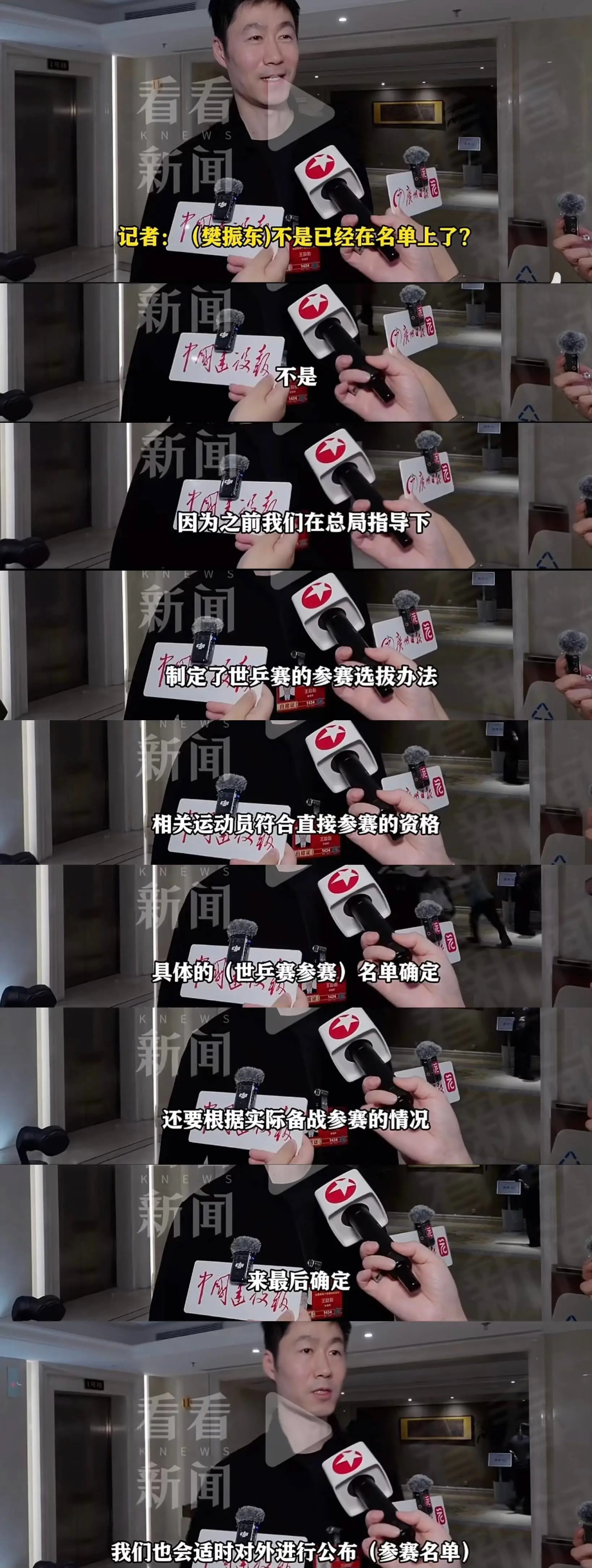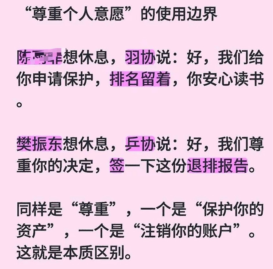 王励勤希望樊振东能代表国家征战 一番话就这样再次把樊振东放在风口浪尖,引得乒丝造谣樊振东立场一整夜。希望樊振东为国征战?是有没有人回应一下是怎么希望的?是速速打印好退排文件同一天交给巴黎奥运会单打冠军(不止樊振东一个人)吗?是单打比赛各种跳过樊振东团体比赛时候又反复横跳主动给樊振东“开辟资格”吗?是口口声声全力保障樊振东,实际上主教练还需要通过外协打听樊振东一个人住在一个小屋子里吗?……你问我是什么阻碍樊振东回归,是奥运会偷笑队友落后也沾沾自喜没人处理我的队友,是从始至终看不见的“公平保障”,是有事樊振东无事烦振东的环境,是第一时间拿着视频造谣樊振东立场却无需负任何责任的乒人球迷。最后,樊振东重压之下拿下巴黎奥运会球迷从不奢望各位感恩戴德,但绝不允许一个创造历史最差成绩的人拥护者在这颠倒黑白。