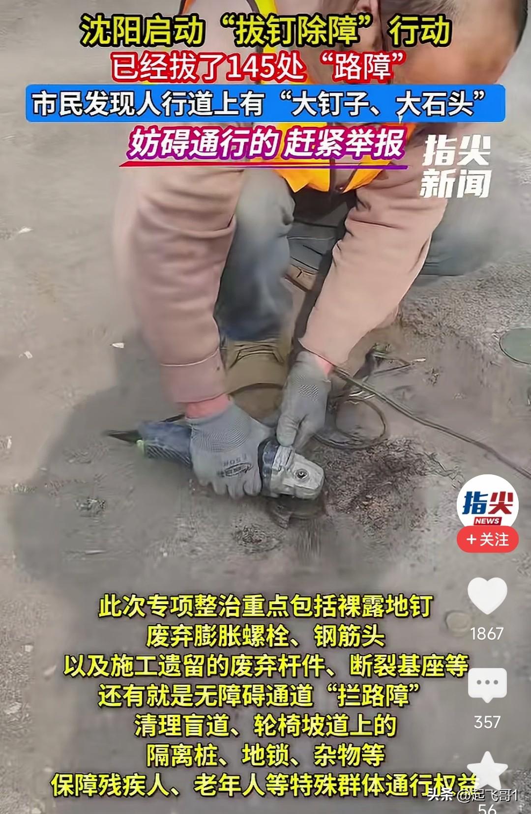 沈阳这样做太好了,沈老大做的对,市民发现人行道上有大钉子,大石头蹬子,妨碍通行的都及时清理了,如果还有请市民及时举报,发现一起拆除一起。 沈阳给全国带了好头,就应该这样,好好的路面用石头蹬给堵上,不让走车,还有的两个石头蹬中间就留一点宽,小车司机手把不好的,还有把石蹬给撞了,造成车辆损坏,特别是从城市往乡村去的路上堵的多,好好的路就不让别人顺畅的走,怕压坏了,你把路面修好一点,豆腐渣工程才怕别人压,还有各地限高杆,害人不浅啊。 沈阳动真格的,把石头蹬移开,路面钉子用角磨机打掉,保道理通行,如有发现及时举报,马上清理,对车辆和行人构成影响的都必须拆掉。 沈老大在东北带头开始了,做的肯定我的大沈阳。