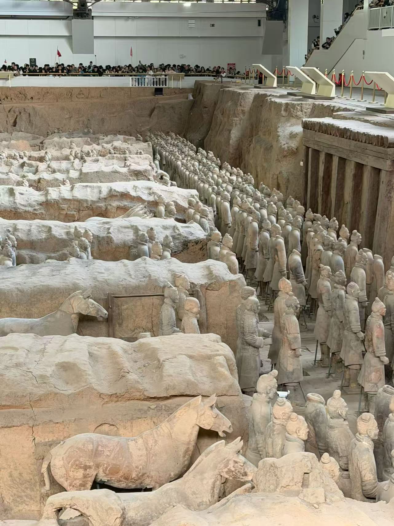 📍秦始皇帝陵博物院 📝推荐游览路线(不走回头路) 北2号门进 → 1号坑(全景震撼,必拍!)→ 3号坑(指挥中心,布局精妙)→ 2号坑(特种部队,跪射俑超完整)→ 铜车马展厅(镇馆之宝,细节绝了)→ 乘免费摆渡车去丽山园看帝陵 → 文创区打卡 📸必打卡景点: ✅ 一号坑,被车兵和步兵,2000年前的军阵狠狠震撼到秦国时代的霸气。 ✅二号坑,骑兵、弩兵,队列复杂,铜车马真的惊讶不愧是世界八大奇迹。 ✅文旅演出,文创雪糕、兵马俑盲盒做道具,都值得打卡。 这里是《世界遗产名录》,也是古代的兵工奇迹,很值得带家人和孩子来打卡!