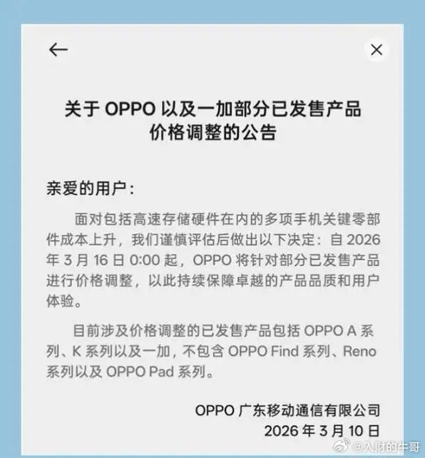 板块机会前瞻——关注四大事件驱动方向,涨价与供给收缩共振,板块景气度有望持续提升。一、消费电子驱动:OPPO一加手机官宣涨价,行业定价中枢上移,产业链盈利预期改善。受益:传音控股、蓝思科技逻辑:内存涨价的连锁反应来了,手机提价带动整机与供应链利润提升,行业需求回暖,头部企业订单充足,业绩弹性明显。二、快递物流驱动:圆通宣布涨价,行业价格体系持续修复,盈利进入上行周期。受益:顺丰控股、韵达股份逻辑:行业定价权回归,单件毛利稳步提高,叠加旺季需求支撑,头部快递企业业绩确定性增强。