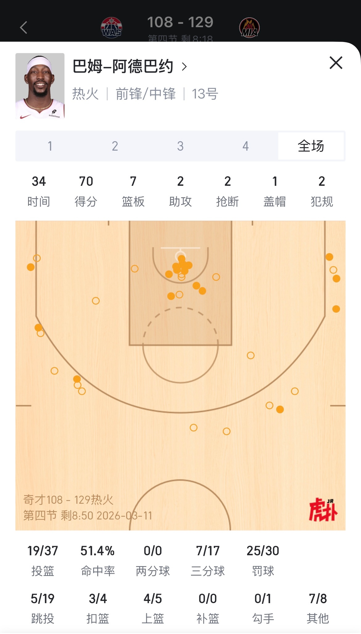 隔壁阿德巴约70分了还有8分钟比赛才结束奇才vs热火 |阿德巴约