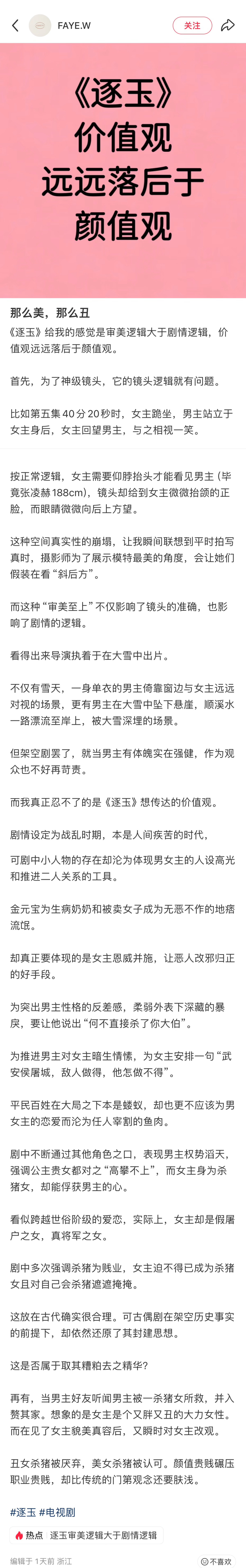 《逐玉》有个网友的评价的很中肯我看了5集觉得怎么说呢,接下来的剧情看也行不看