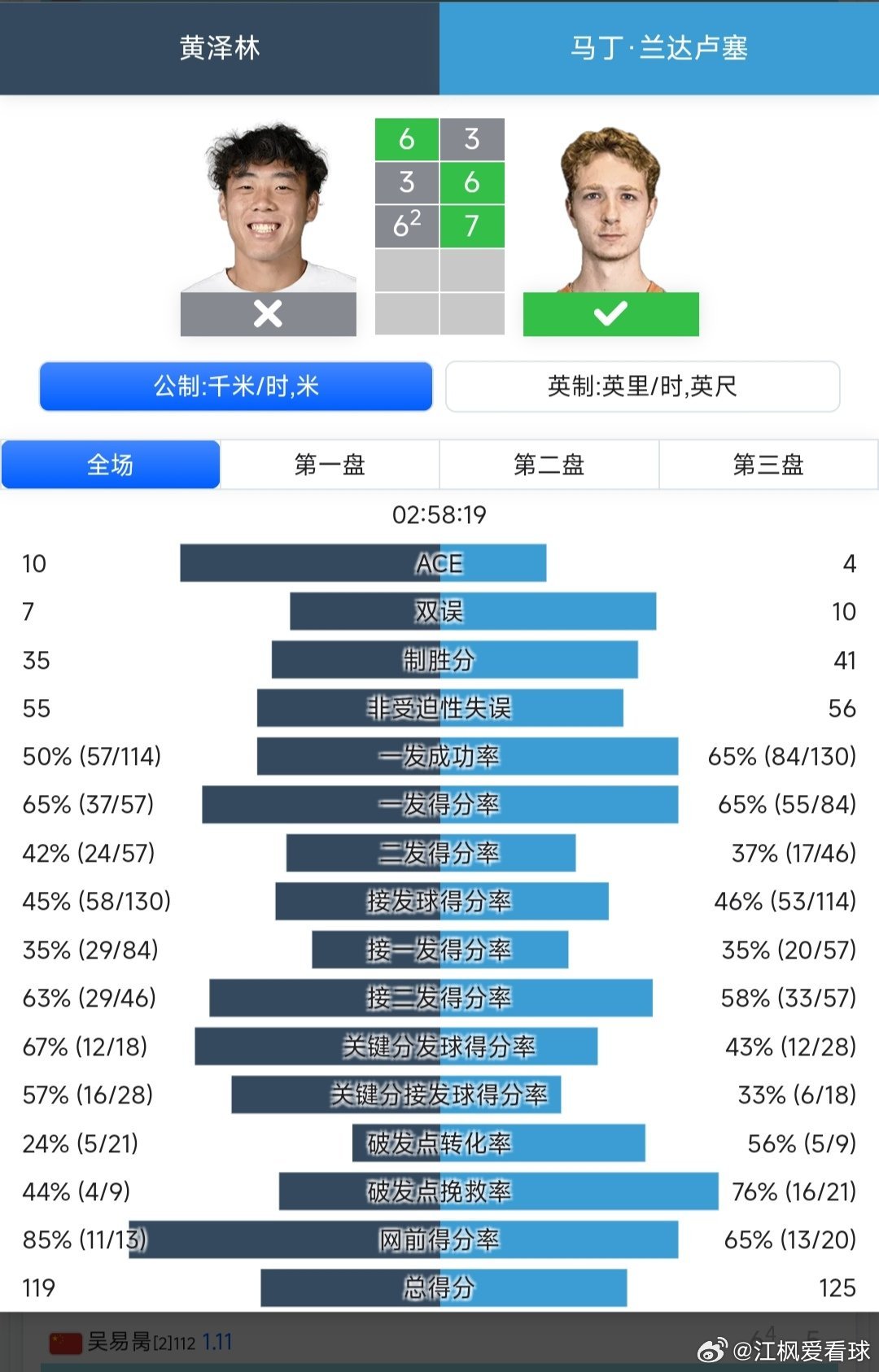 黄泽林🇭🇰6-3/3-6/6-7(2)不敌兰达卢塞🇪🇸。