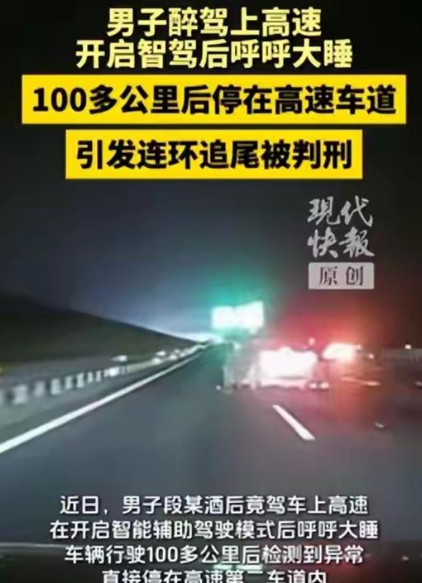 “心真大!”扬州,男子与朋友聚会,喝了不少酒,突然心血来潮,要开车上高速回老家,上车他就困了,直接开启“智驾”便放心呼呼大睡,谁料,男子双手离开了方向盘,辅助驾驶停止工作,车停在了高速第二车道,导致连环追尾,最终,男子悲剧了。 最近扬州境内的京沪高速上,出了一起让人既气愤又惋惜的交通事故,全都是因为一名男子的侥幸和无知,最后不仅自己栽了,还连累了别人。 事情的主角是段某,事发前一天晚上,他和朋友聚在一起吃饭,推杯换盏间喝了不少酒,醉意上头不说,还突然心血来潮,想着开车上高速回河南老家,都说喝酒不开车、开车不喝酒,这是连小孩都知道的道理,可段某偏不当回事。 上车之后,酒劲加上疲惫感一下子涌了上来,段某困得睁不开眼,他没有停车休息,反而打起了车上智驾功能的主意,他直接开启了智能辅助驾驶,往座椅上一躺,就放心地呼呼大睡起来,双手完全脱离了方向盘。 他以为智驾能全程替他开车,可他根本没搞明白,现在车上的智驾根本不是全自动驾驶,只是辅助功能,没一会儿,车辆系统感应到他双手离开方向盘,直接停止了工作,车子失去控制后,稳稳停在了高速第二车道中间,一动不动。 高速上车辆行驶速度都很快,后面的车根本来不及反应,先是徐某驾驶的小轿车猝不及防撞了上去,没过几分钟,黄某开的另一辆小轿车又追尾了徐某的车,三车连环相撞,场面一片混乱,还造成了多人受伤。 民警赶到现场后,一靠近段某就闻到了一身浓重的酒气,随后的酒精检测显示,他的血液酒精含量达到了99.3mg/100ml,已经属于醉酒驾驶,妥妥的违法,面对民警的询问,段某一脸懵,对于追尾事故的经过,他完全记不清。 后来经过调查,段某是从常州出发,打算开高速回河南老家,没想到一时糊涂,做出了醉酒开智驾的荒唐事,这件事的结局,段某也彻底悲剧了,他被依法吊销机动车驾驶证,五年内不能重新考取,还被检察机关提起公诉。 最后被判犯危险驾驶罪,拘役一个月十五日,罚金四千元,其实现在很多人都有个误区,觉得开了智驾就万事大吉,能解放双手甚至睡觉,可实际上,智驾只是辅助,不能代替司机开车。 段某的例子就是个惨痛的教训,他不仅醉酒驾驶,还滥用智驾功能,把自己和别人的生命安全当儿戏。 不管车子的智驾功能多先进,司机始终是安全的第一责任人,双手不能离方向盘,更不能在驾驶过程中睡觉分心,酒后开车本身就是违法,再加上滥用智驾,更是错上加错,最后只能自食恶果。