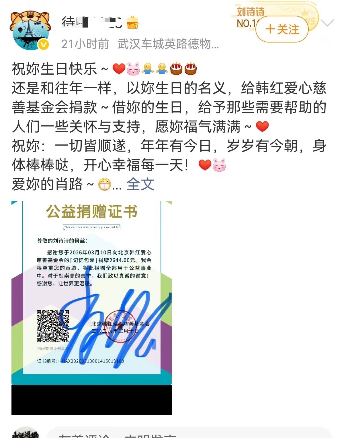 刘诗诗生日,刘诗诗粉有捐款的,有做公益的,有做剪辑,修图的,有控转和评的,还有留言,以及给自己买蛋糕的刘诗诗0310生日快乐刘诗诗39岁捧花照