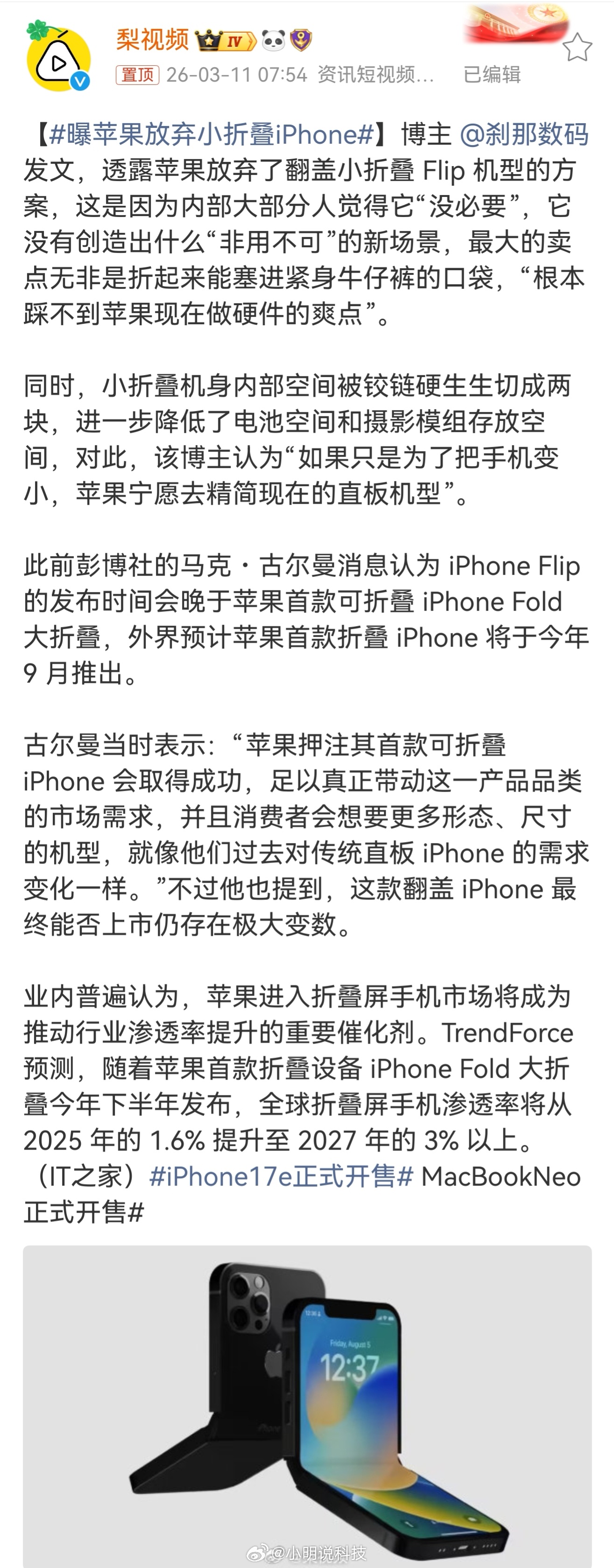 曝苹果放弃小折叠iPhone,我觉得很正常,苹果本来就精得很!小折叠也就胜在折叠后好塞口袋、颜值吸睛点,为了这俩点,电池、影像全大幅缩水,维修成本还高,本身就是小众需求,受众根本撑不起销量。与其做这种妥协多、性价比低的“小而美”,不如把直板机的边框、手感、续航、影像优化到极致,体验更完整、走量更稳,怎么算都比硬做小折叠划算,苹果肯定不会做这种赔本买卖的,你们觉得呢?