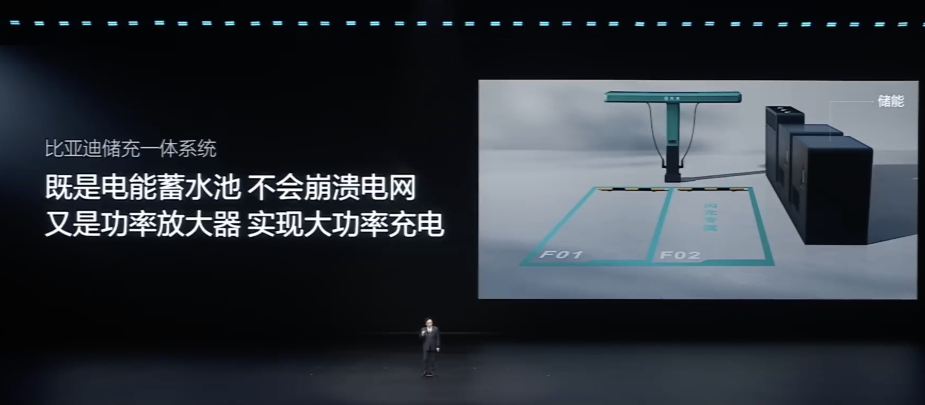 还有人会担心另一个问题:车有闪充,但这么快的功率电网能不能顶得住。比亚迪也提前考虑到了,每一个闪充桩都会配套超级快放的储能系统,平时先把电存起来,需要充电的时候再瞬间释放出来提升功率,相当于是“先存电、再快放”。这样既能保证闪充的速度,也不会直接给电网带来额外负担,更不用担心多车同时充电抢电的问题。