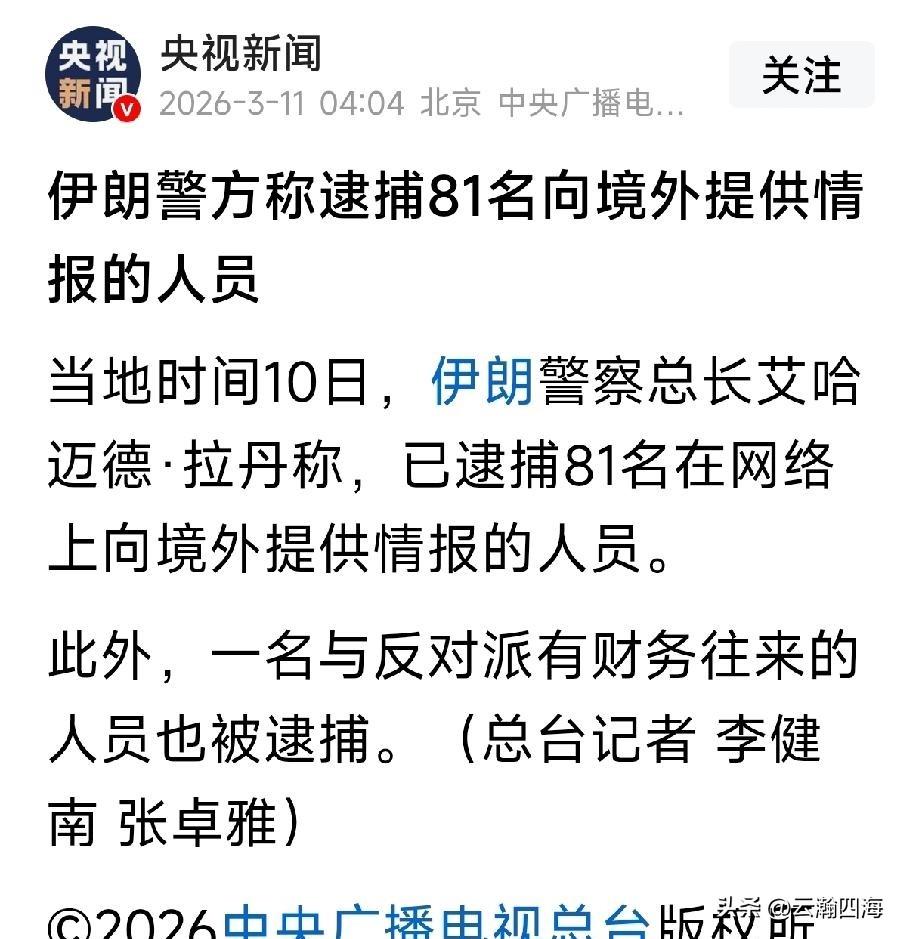 从《央视新闻》得知 伊朗这次一口气抓了81个人,说白了就是一场针对“内鬼”的大清扫。在网络时代,情报战早就不是什么新鲜事,几张随手拍的照片、几句不经意的闲聊,都可能被别有用心的人利用。这些人以为躲在屏幕后面就能为所欲为,实际上早就被盯上了。几张随手拍的照片、几句不经意的闲聊,都可能被别有用心的人利用。伊朗情报人员 伊朗这次“大扫除”这么做主要是想堵住情报泄露的口子,切断反对派的后援,震慑内外敌人。但愿伊朗那些向境外提供情报的人员能清醒,那是那是卖国呀!没有国哪有家!伊朗高层出逃 伊朗叛徒 伊朗反谍行动 伊朗斩首事件