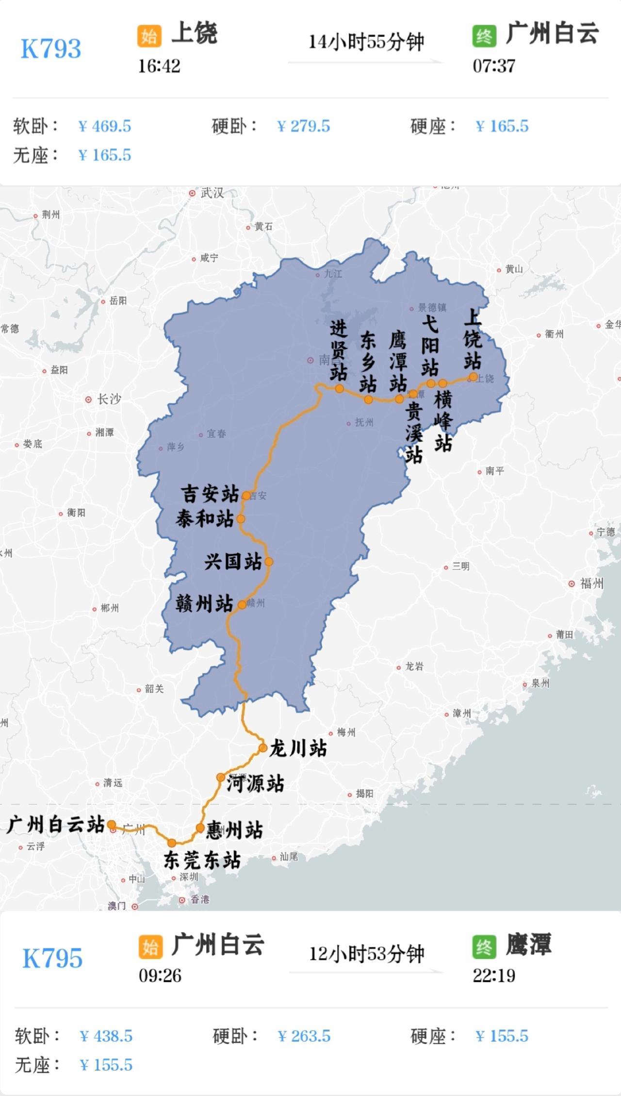 广州、东莞到鹰潭朝发夕至 广州白云到鹰潭K795/K794次 广州白云站9点26