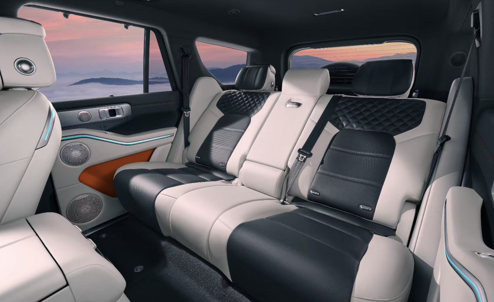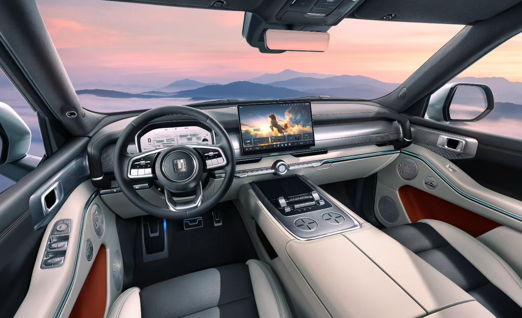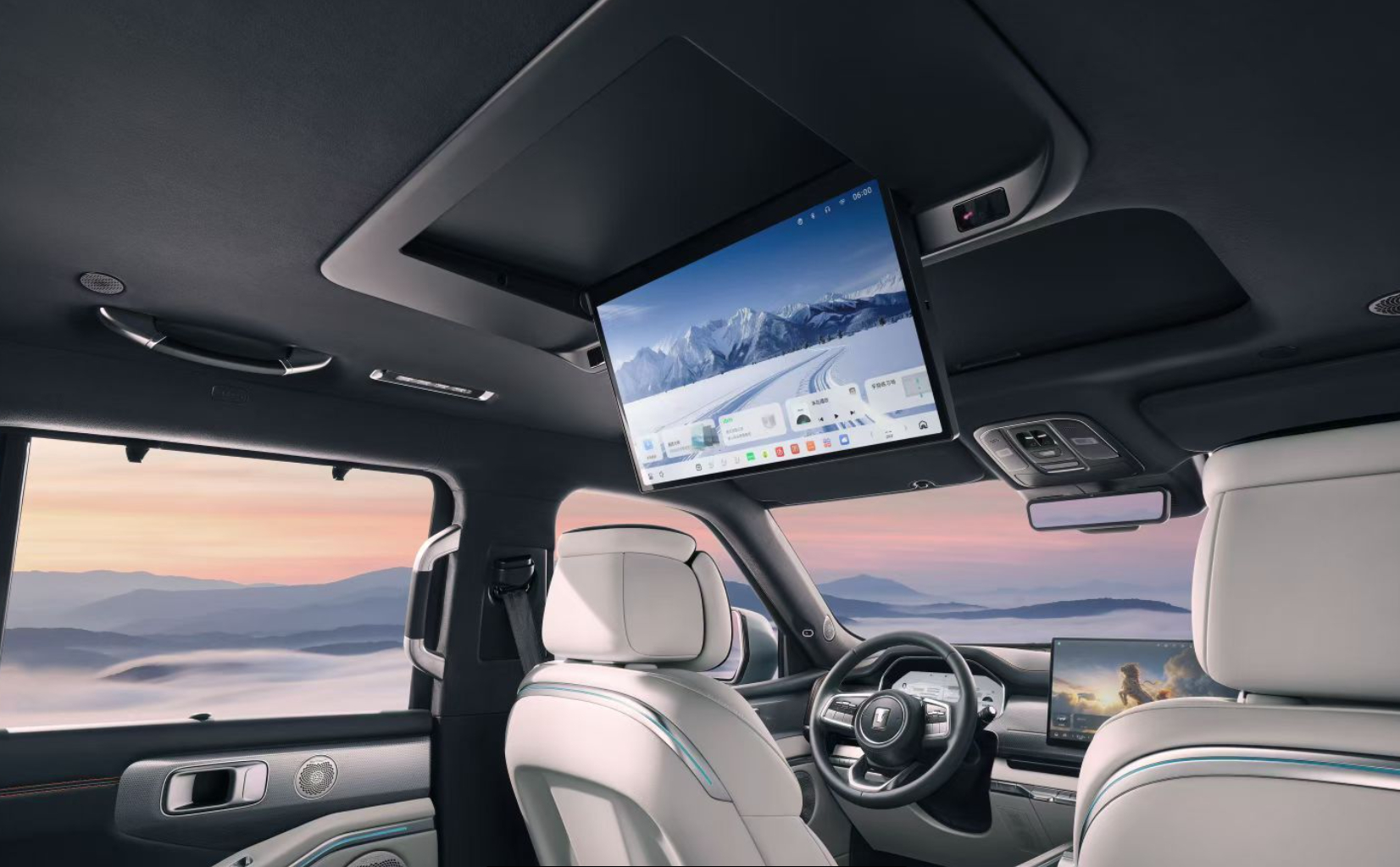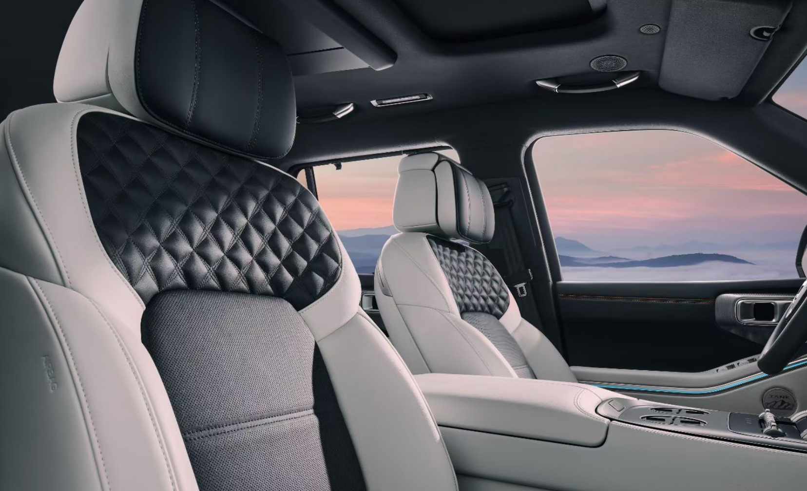 车若初见全新坦克700Hi4-Z发内饰官图,前排悬浮中控屏,后排翻折吸顶屏,