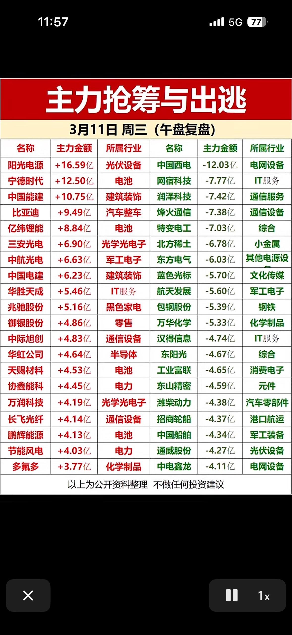 3月11日主力抢筹与出逃,市场热点行业分析! 3月11日的市场那叫一个精彩!早盘30分钟,主力资金抢筹果断,科技赛道成了主战场。光模块、AI算力硬件与新能源龙头领域被重点进攻。像天孚通信、中际旭创这些光模块与算力硬件龙头,在行业景气和展会临近的双重刺激下,吸金能力超强。宁德时代、比亚迪等新能源核心标的也构筑起防守反击阵地,工业富联、剑桥科技等AI硬件核心个股同样受青睐。 到上午11时,沪指微涨,上涨个股2000多只,不过光伏设备、储能概念、锂电池板块表现亮眼,主力资金大幅净流入,宁德、阳光资金净流入超10亿。市场正进入以“科技核心资产”为锚的结构性行情,投资者得看清主力调仓节奏,关注有产业景气度和业绩确定性的方向。