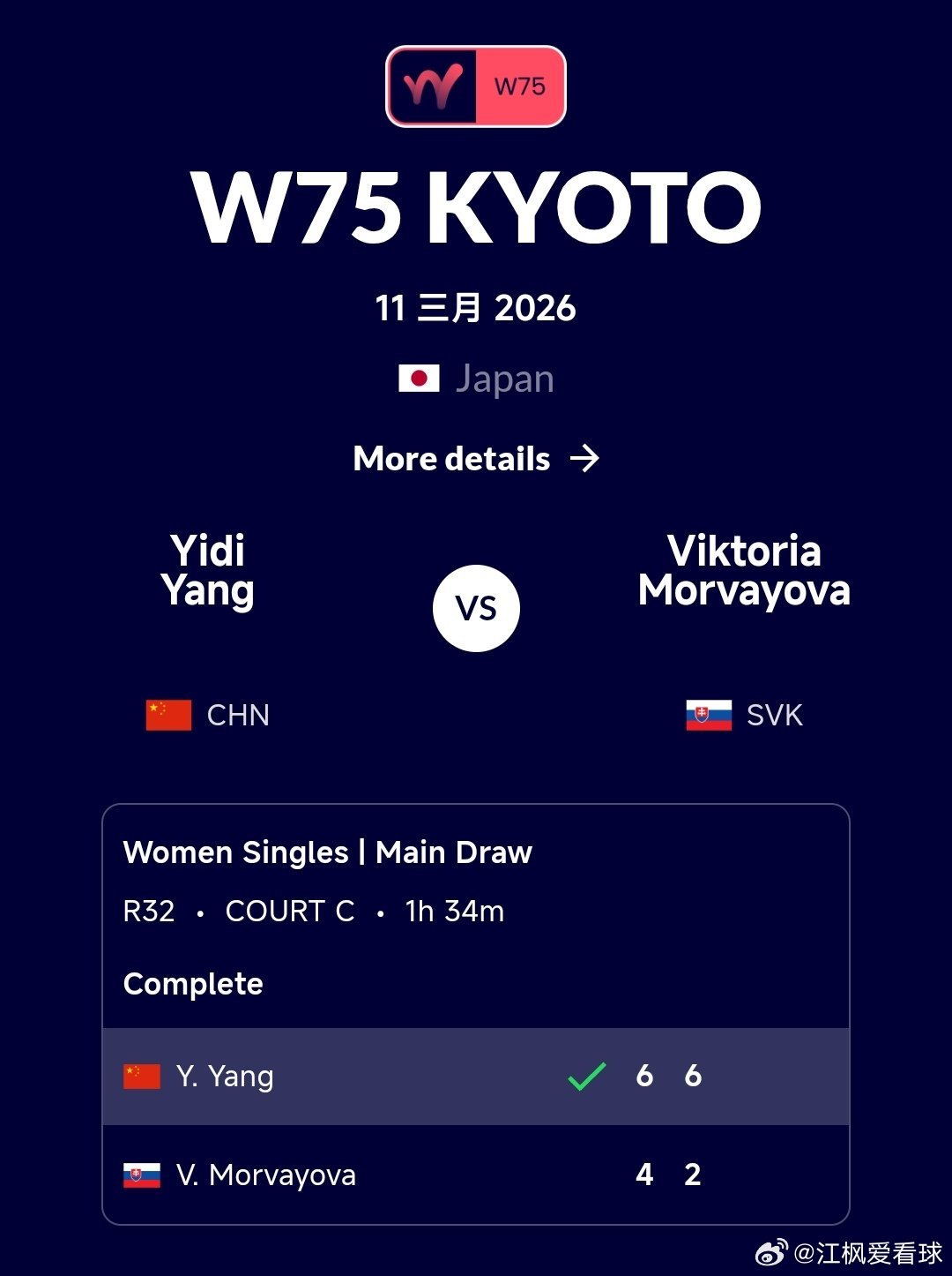 资格赛晋级的杨一迪🇨🇳6-4/6-2战胜摩尔瓦约娃🇸🇰,晋级下一轮,恭喜杨一迪!🎉🎉🎉