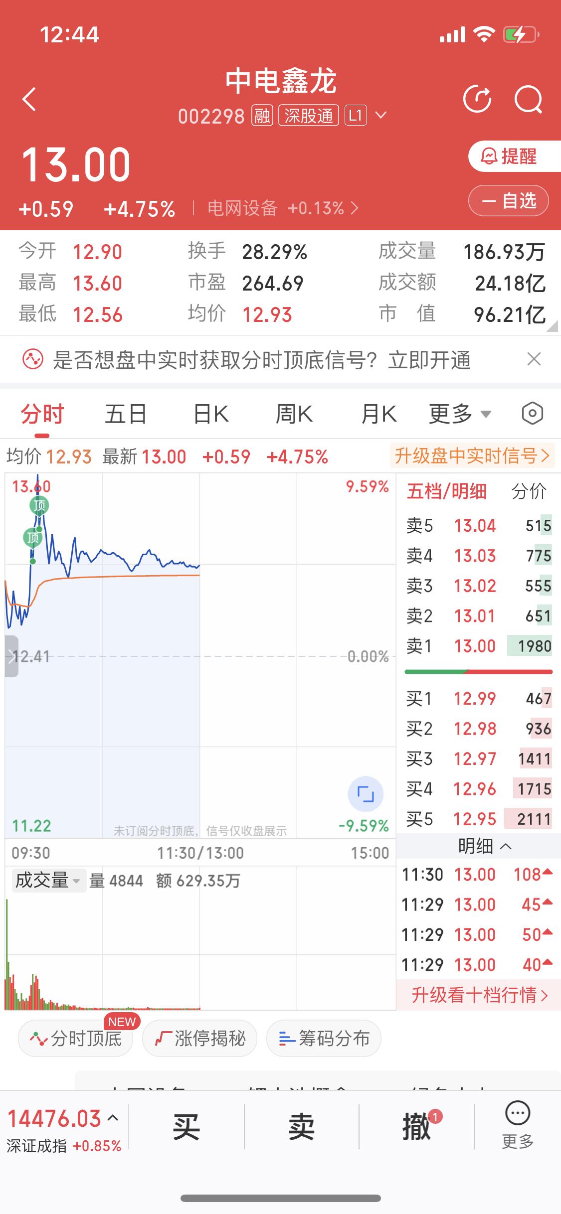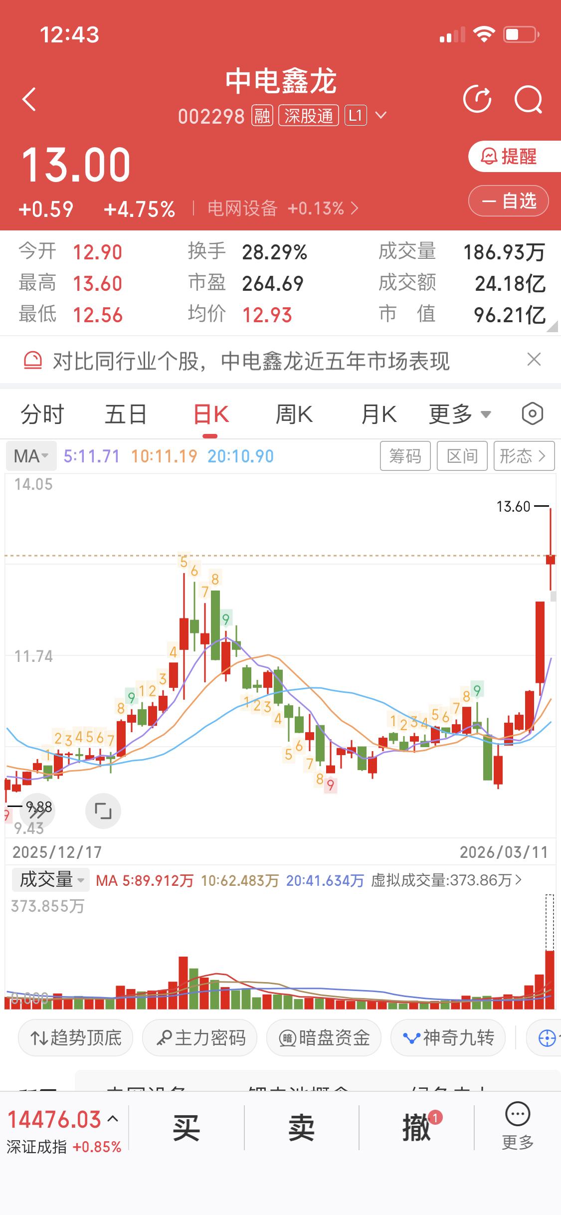 3月10日中电鑫龙涨停,收盘12.41元,总市值达91.85亿,今天涨停炸板。从分时图看跌到当天价格均线,日线图是压力位跳空高开、放量突破箱体,看着确实挺强势。 3月11日电网设备板块活跃,中电鑫龙涨幅居前。它这次涨停,主要是业绩亏损大幅收窄,2025年预计净利润亏损同比减少70.94% - 81.92%;子公司获2.58亿债务豁免,还用公积金弥补18.98亿亏损。 不过股票这东西,谁也说不准。既然觉得看涨,下午可以小仓位试试,但一定得控制好风险。