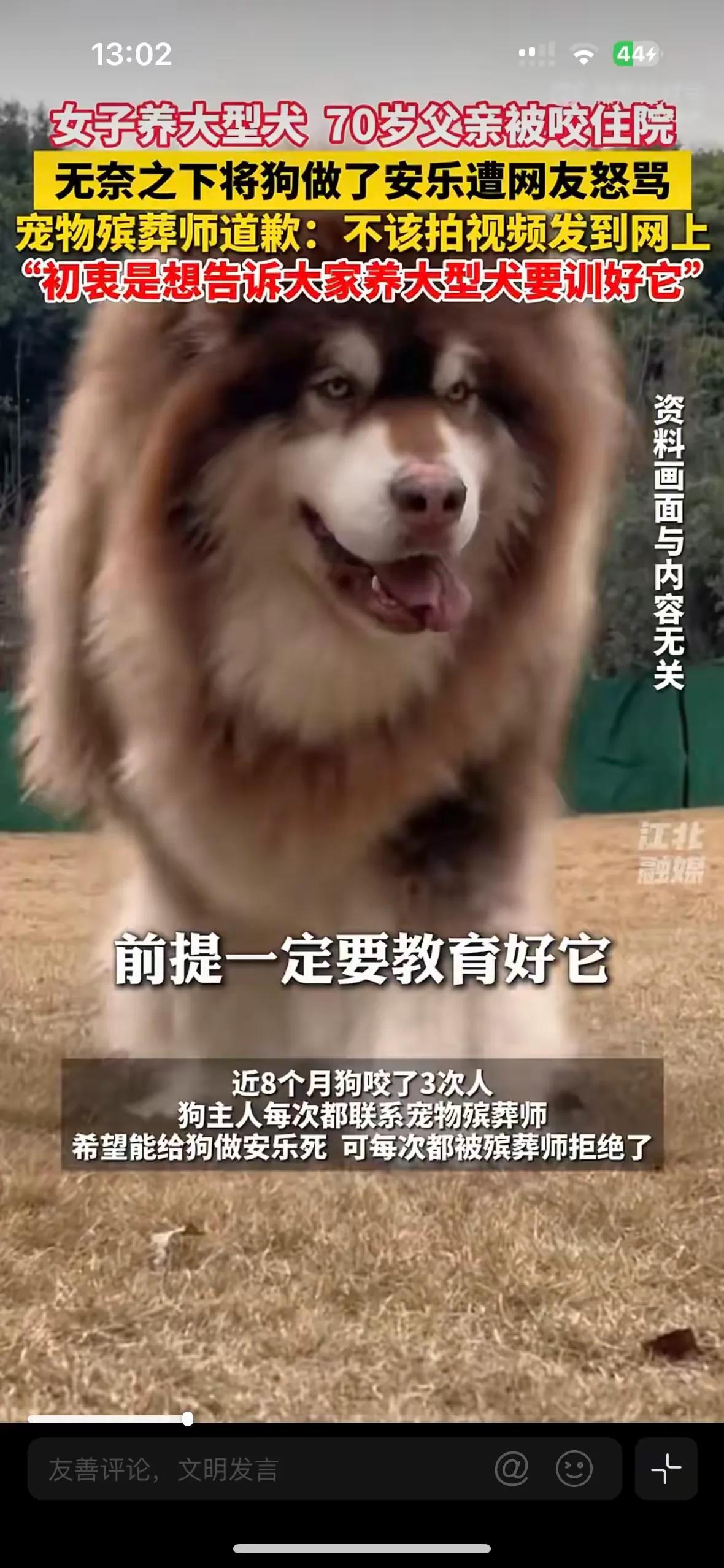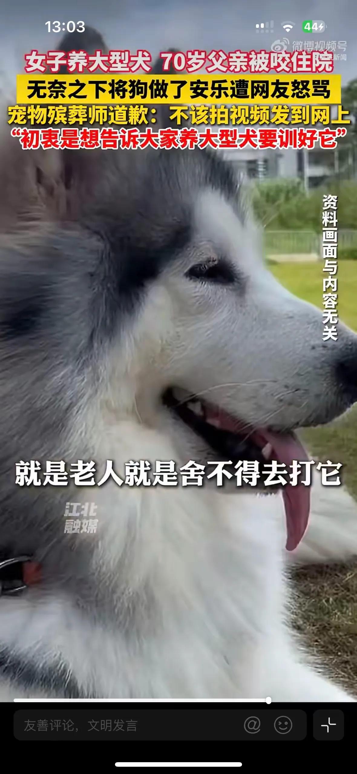 太让人揪心了!江苏一位女士把自己养了7年的狗狗阿拉斯加送去安乐了,它在近8个月里咬了3.4个人,扑咬邻居,抓伤串门的访客,这次是直接把70多岁的老父亲咬进了医院。 主人之前就找过驯犬师,给狗狗戴嘴套,限制它的活动,它这次却把带它的老父亲咬进了手术室,主人才痛定思痛把它送去安乐死。 这只阿拉斯加陪着主人走过了7年时光,从毛茸茸的小奶狗长成了百来斤的大家伙,早就是家里的一份子。主人说,每次它闯祸,自己都在崩溃和心软里反复拉扯。找过专业驯犬师,花了大价钱纠正行为,可一回到熟悉的环境,狗狗还是会露出攻击性。出门必戴嘴套,在家也得关在围栏里,连老人想摸一摸它都要小心翼翼,可就算这样,意外还是发生了。那天老人牵着它散步,不知哪根神经被触发,它突然暴起,对着老人的手臂狠狠咬下去,伤口深可见骨,直接被推进了手术室。 躺在病床上的老父亲,和眼前这个养了7年的“家人”,让主人没得选。一边是随时可能再伤人的大型犬,一边是年迈脆弱的至亲,她只能亲手给陪伴自己多年的伙伴画上句号。可这段无奈的选择被发到网上后,却引来了铺天盖地的谩骂。有人骂她“冷血”“不配养宠物”,有人说“明明可以送救助站,为什么要杀了它”,甚至有人翻出她的私人信息进行网暴。 宠物殡葬师后来也站出来道歉,说不该把视频公之于众,初衷只是想提醒大家养大型犬一定要训好。可这迟来的道歉,根本挡不住网友的情绪宣泄。大家盯着“安乐死”三个字,却没人愿意看看主人在这8个月里的挣扎:她试过所有能想到的办法,从行为矫正到物理约束,可一次次的伤人事件,早就把她的耐心和希望磨得精光。 这件事最讽刺的地方,从来不是主人“狠心”,而是我们对“宠物责任”的集体失语。很多人养大型犬,只图它威风可爱,却忽略了这类犬种需要高强度的训练和严格的管理。当狗狗出现攻击行为时,不是所有人都有能力、有资源去纠正,更不是所有问题犬都能找到愿意接收的救助站。在“爱狗人士”的道德绑架里,没人关心被咬伤的老人要承受多少痛苦,没人在意主人在亲情和宠物之间的撕裂,大家只愿意站在道德高地上,对着一个走投无路的母亲指指点点。 我们总说“爱它就要对它负责”,可这份责任从来不是单方面的溺爱,更不是无视他人安全的纵容。当宠物的存在已经威胁到家人和邻居的生命安全时,所谓的“善良”,其实是对无辜者的残忍。 各位读者你们怎么看?欢迎在评论区讨论。