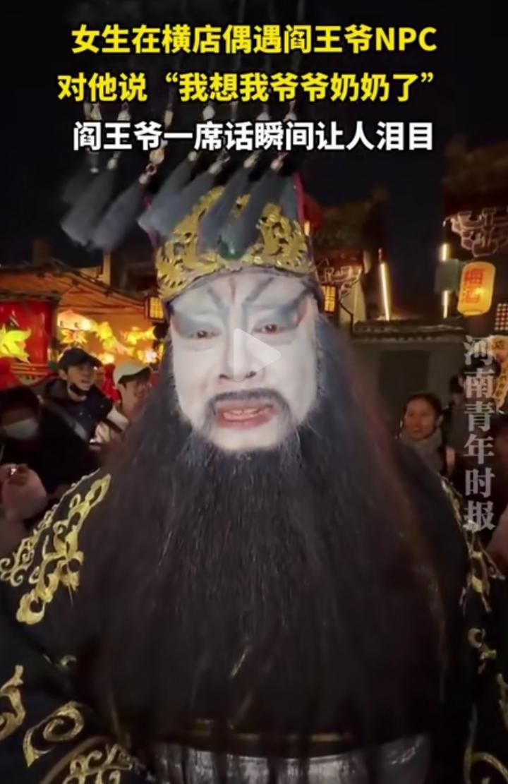 3月6日浙江,一女生在横店偶遇扮作阎王爷的NPC,女生大声喊:“阎王爷,我想我爷爷奶奶了”,这位“阎王爷”说:“你爷爷奶奶没在我这儿,他们在天堂享福呢!” 他用最温情的谎言,慰藉了女孩思念亲人的心,让遗憾多了份慰藉,让思念有了归处。这世间最动人的从不是鬼神传说,而是陌生人不经意间的温柔与共情,一句话抚平心底的思念,这才是最暖心的人间烟火。