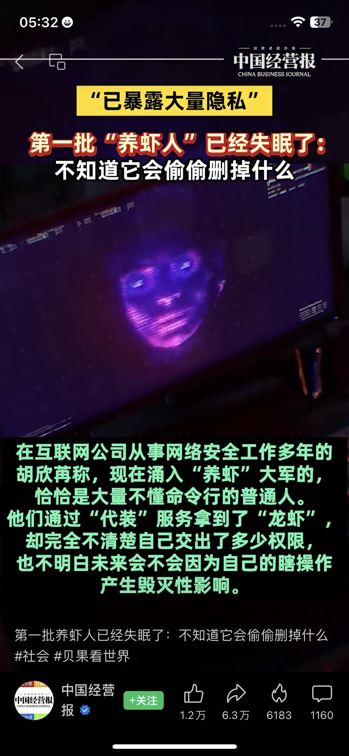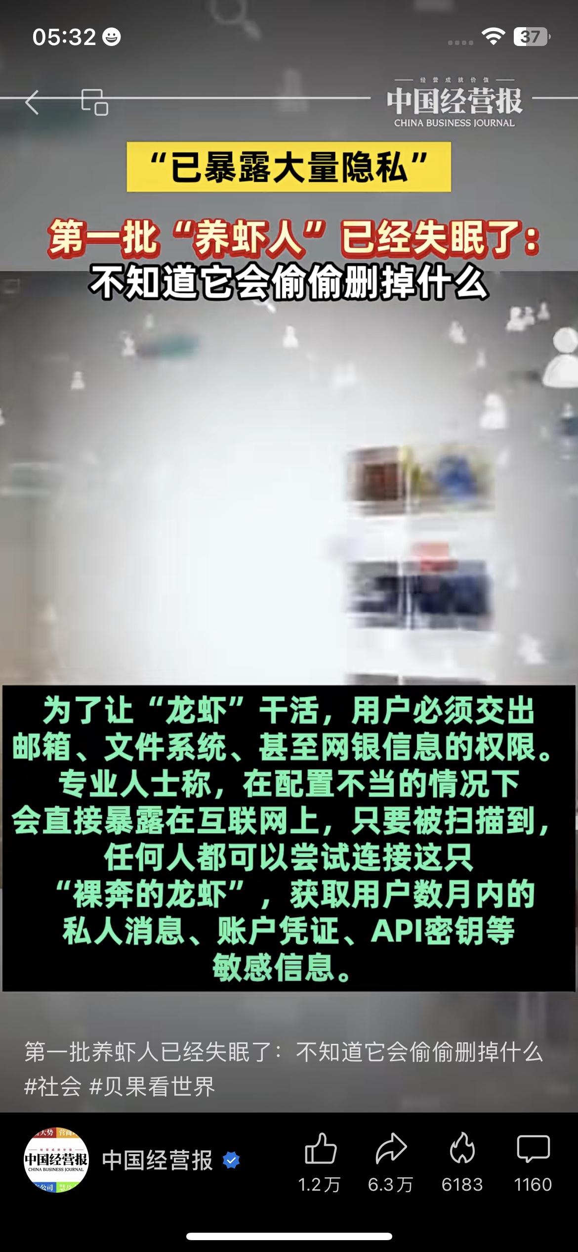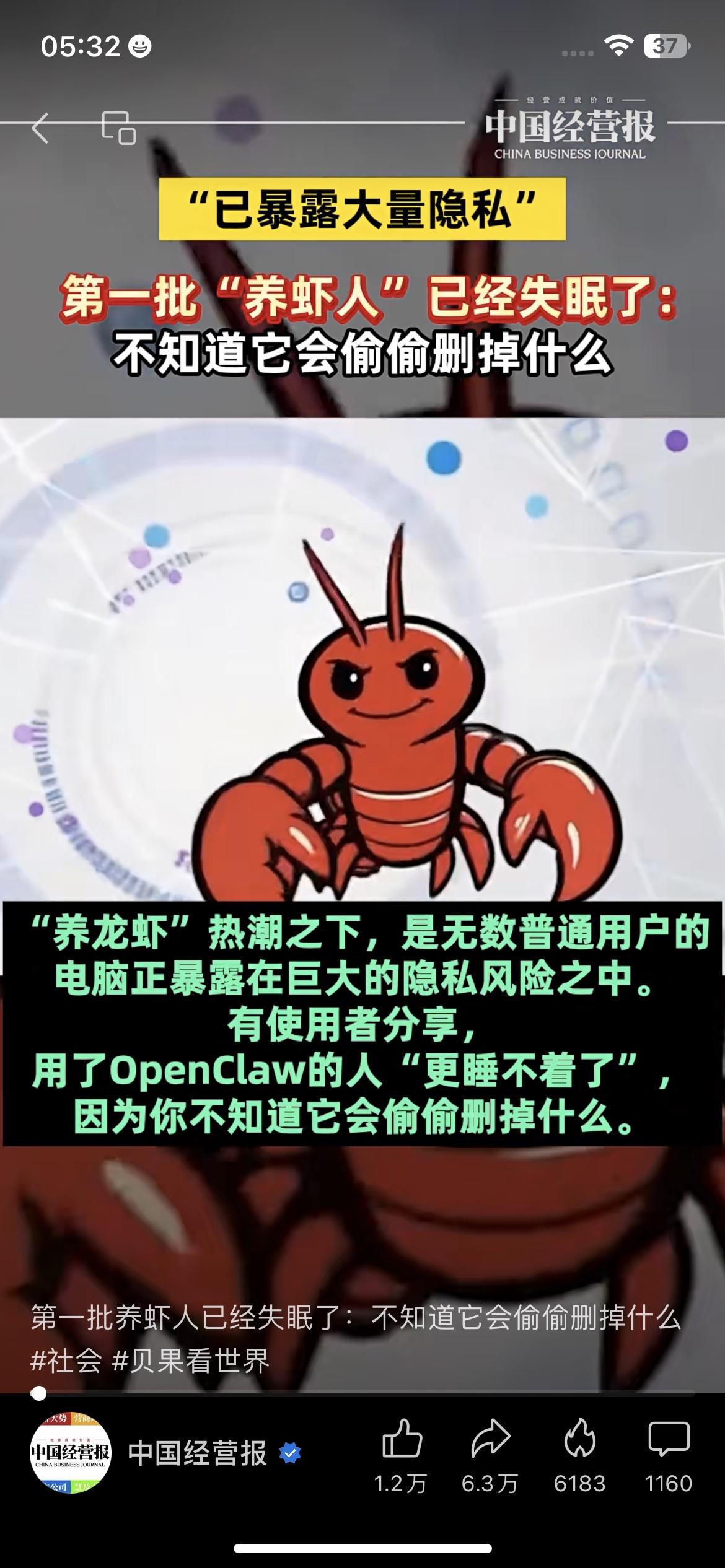 27万只“裸奔龙虾”!第一批“养虾人”失眠:隐私全漏光,一秒就能被搬空? 中国经营报刚爆的料,看得我后背发凉:现在涌入“养虾”大军的,全是不懂命令行的普通人,为了让“龙虾”干活,直接交出了邮箱、文件系统,甚至网银信息的权限! 更吓人的是,已经有27万只“裸奔龙虾”被扫描出来,配置不当就直接暴露在互联网上,黑客一秒就能搬空你的私人消息、账户凭证、API密钥……第一批“养虾人”已经失眠了:不知道它会偷偷删掉什么,也不知道明天醒来钱还在不在。 咱身边就有朋友跟风“养虾”,连权限是啥都没搞懂就点了同意,这哪是薅羊毛,分明是把家门钥匙塞给了小偷! 养虾人隐私风险 网络安全 反诈提醒