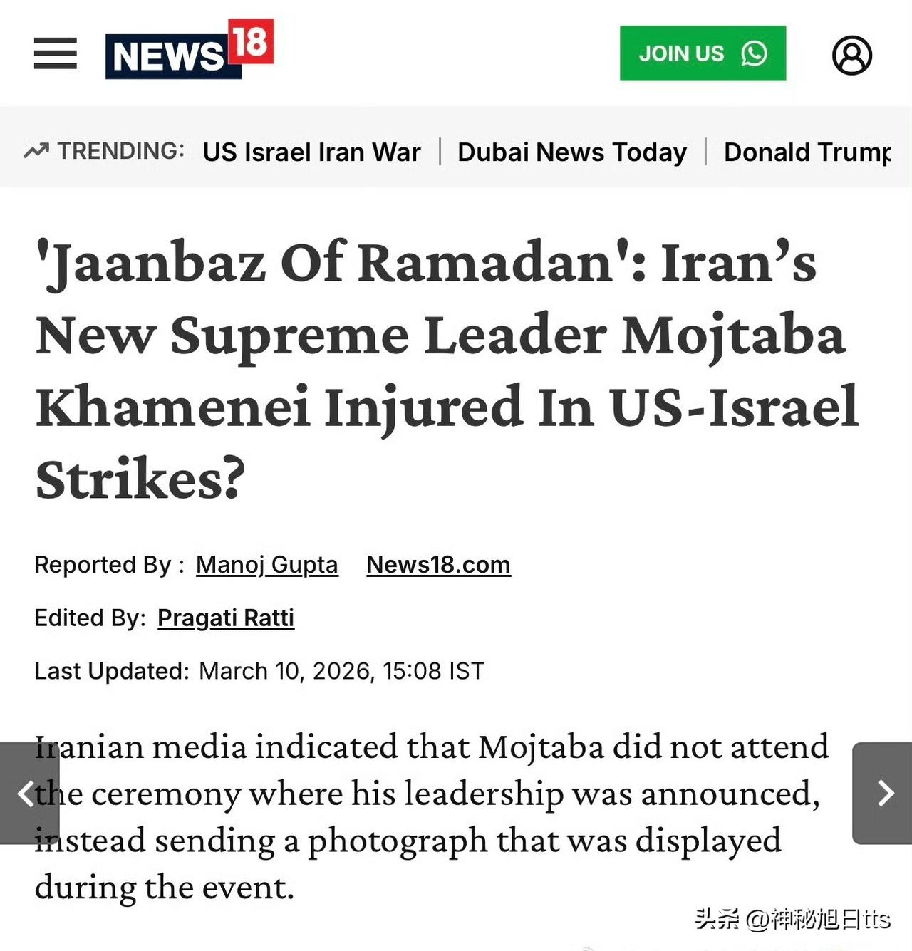 伊朗新最高领袖穆杰塔巴·哈梅内伊在美以空袭中受伤 在伊朗、以色列和美国冲突持续升级的背景下,伊朗政权内部也出现重大变化。伊朗最高领袖阿里·哈梅内伊在战争初期空袭中身亡后,其子穆杰塔巴·哈梅内伊被确认接任最高领袖。然而,有消息称他在美以空袭中受伤。伊朗官方媒体甚至称其为“斋月的勇士”,暗示政权正在塑造一种为国家受伤、具有牺牲精神的领导人形象。以下为全文翻译。 据印度高级情报来源称,伊朗新任最高领袖穆杰塔巴·哈梅内伊据称在近期美国与以色列对伊朗发动的空袭中受伤。此次空袭发生在持续升级的地区冲突背景下。 伊朗国家电视台称他为“斋月的勇士”(Jaanbaz of Ramadan)。“Jaanbaz”这一词通常用来形容在为国家服务时受伤的人,这一说法暗示伊朗政权可能正在为这位新领导人塑造一种为国家牺牲、负伤仍坚持领导的形象。 穆杰塔巴的晋升发生在其父亲、伊朗前最高领袖阿里·哈梅内伊遇刺身亡几天之后。阿里·哈梅内伊在伊朗、以色列和美国战争爆发初期的空袭中被击毙。 穆杰塔巴继任最高领袖的决定由伊朗强大的神职机构——专家会议确认。这也标志着伊斯兰共和国历史上首次出现最高权力从父亲直接传给儿子的情况。 此外,伊朗媒体还透露,在宣布其领导地位的仪式上,穆杰塔巴本人并未出席,而是发送了一张照片,在活动现场展示。 美以对伊朗动武会有哪些影响