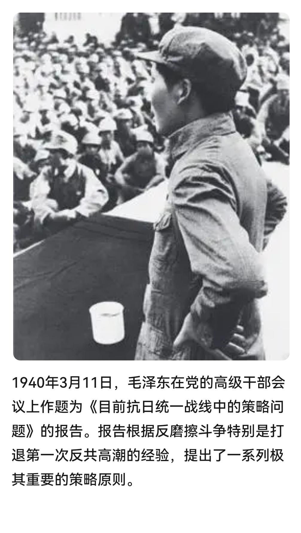 #建国丰功伟绩 历史上的今天:1940年3月11日,毛泽东在党的高级干部会议上作题为《目前抗日统一战线中的策略问题》的报告。报告根据反磨擦斗争特别是打退第一次反共高潮的经验,提出了一系列极其重要的策略原则。