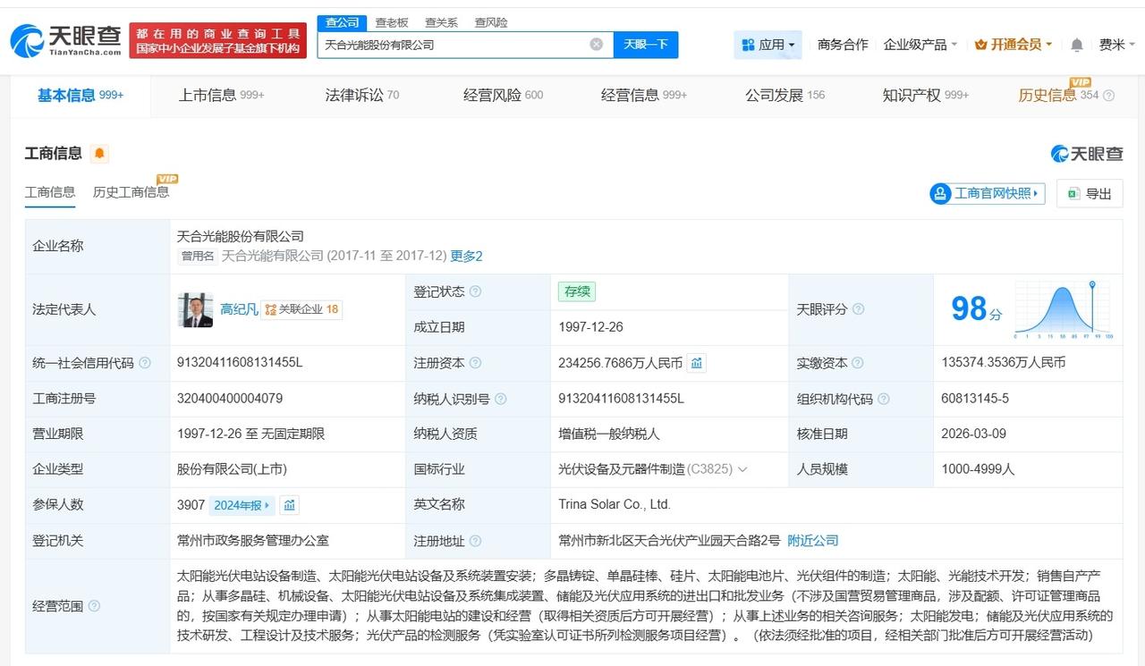 天合光能增资至约23.4亿 天眼查App显示,近日,天合光能(688599)发生工商变更,注册资本由约21.8亿人民币增至约23.4亿人民币。 天合光能股份有限公司成立于1997年12月,法定代表人为高纪凡,经营范围包括太阳能光伏电站设备制造、太阳能光伏电站设备及系统装置安装等。股东信息显示,该公司由江苏盘基投资有限公司、高纪凡、华福资本管理有限公司等共同持股。 天眼查信息: