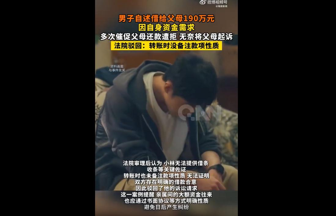 广西平南县小林累计借给父母190余万元用于家庭开支和生意周转,双方仅口头约定未签借条、未备注款项性质。 小林因自身资金需求催还未果起诉,法院因无证据证明借款合意,驳回其诉讼请求。 190万,是一份沉甸甸的孝心与信任,却换来父母的拒不归还和法庭的驳回判决,小林的遭遇,既令人心寒,更给所有成年人上了一堂血淋淋的教训——亲情再浓,也不能模糊边界;关系再近,也不能忽视规则,所谓“亲情无价”,从来不是透支信任、肆意妄为的借口。 最令人不齿的,是这对父母的自私与凉薄。 孩子念及亲情,在父母有需求时倾囊相助,累计拿出190余万元,没有丝毫犹豫,这份孝心与付出,本该被珍惜、被铭记。 可当孩子自身有资金需求,多次催还时,他们却选择拒不归还,无视孩子的难处,践踏孩子的信任,把亲情当成了索取的工具,把孩子的付出当成了理所当然,何其自私,又何其寒心。 小林的悲剧,一半源于父母的凉薄,一半源于自己的疏忽与天真。 他天真地以为,亲情可以替代规则,口头约定可以替代书面凭证,却忘了人心复杂,哪怕是至亲,也可能在利益面前翻脸不认人。 190万的大额资金往来,不签借条、不收收条,转账时不备注款项性质,这种毫无防范的信任,最终变成了刺向自己的利刃,让自己陷入“有理说不清”的绝境,追悔莫及。 法院的判决,看似“无情”,实则公平公正。 法律讲究证据,没有借条、没有备注,无法证明借款合意,驳回诉讼请求无可厚非。 这一判决,更是狠狠戳破了“亲情大于一切”的虚伪滤镜——亲情值得珍惜,但不能凌驾于规则之上;信任值得付出,但不能毫无底线。 亲属间的大额往来,明确书面约定,不是不信任,而是对彼此的保护,更是避免日后反目成仇的底线。 现实中,太多人被“亲情”绑架,觉得谈规则、签协议就是生分,觉得大额往来碍于情面,不必留下凭证。 可小林的经历告诉我们,正是这种“碍于情面”,才给了某些人肆意践踏信任的机会;正是这种“忽视规则”,才让自己在利益受损时束手无策。亲情不该成为规则的绊脚石,更不该成为自私者的“保护伞”。