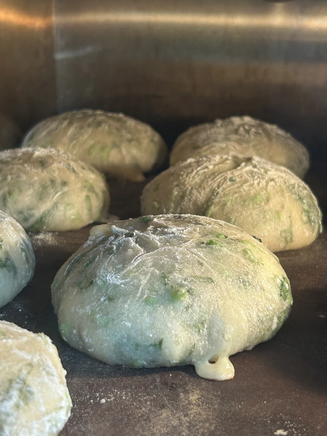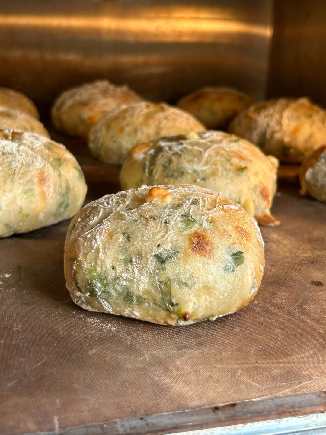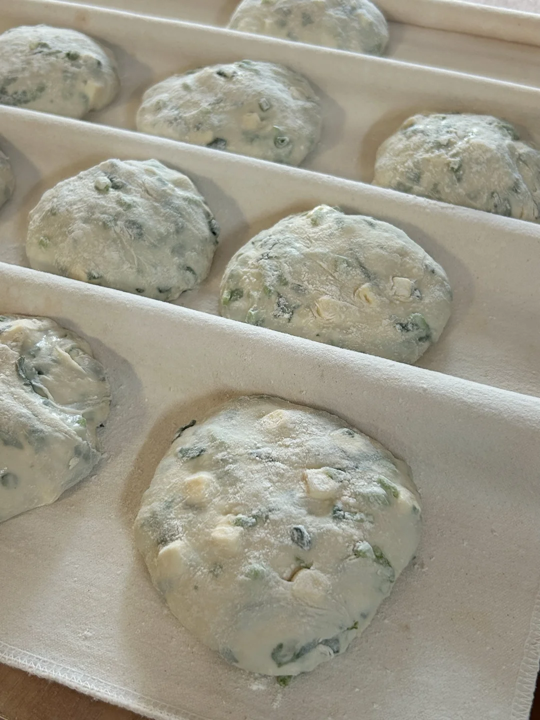 记录分享: 烫种: T80 50|高粉 50|开水 200|盐 2 烫成团以后,冷藏备用。 主面团: 烫种 300|高粉 450|水 290+150+50|盐 9|鲜酵母 5|芝麻油 22 出缸 20 ℃ 辅料: 芝士丁 150|大孔芝士 30 香葱 50|茼蒿 |200 折叠斩拌进面团 松弛半小时,翻面整理面团 入冷藏,隔夜 18 个小时左右。 次日:回温 1 个小时 分割 170 面团 ✖️10 平炉 SP50 上火 250 下火 240℃,18 分钟