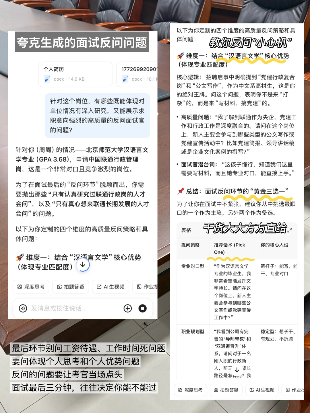 ✓反问要深。别问工作待遇、工作时间等死问题,问体现你思考了的问题。比如我帮表妹用夸克生成面试押题反问问题,它提出岗位挑战等问题让考官当场点头。面试最后三分钟,往往决定能不能过。