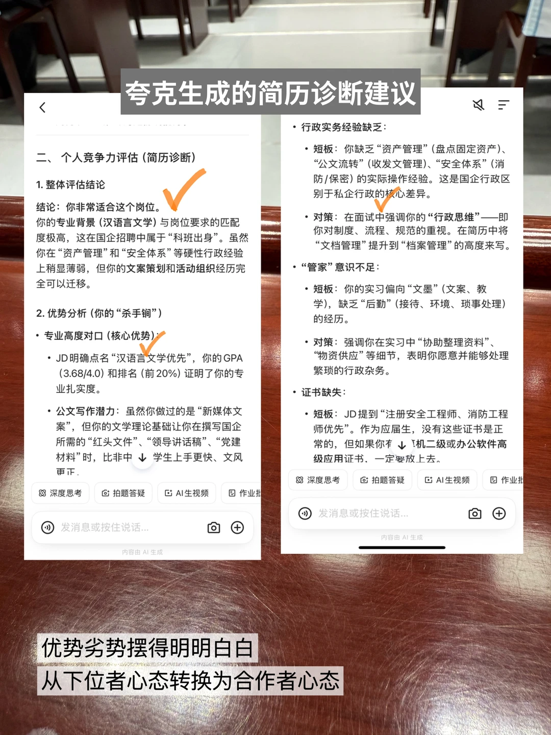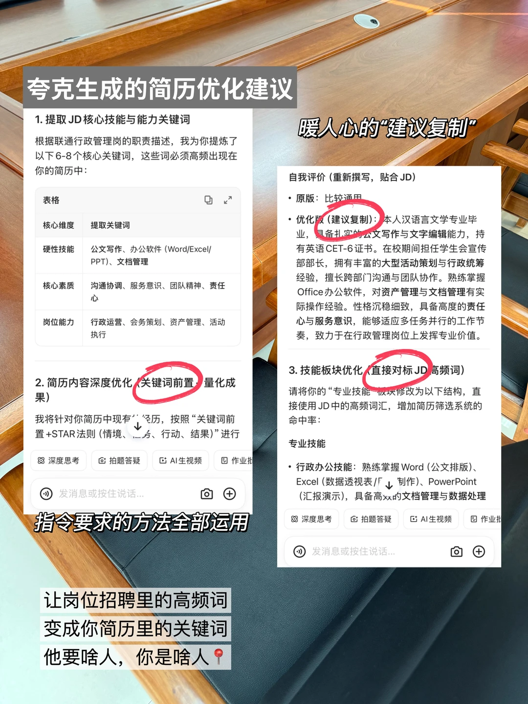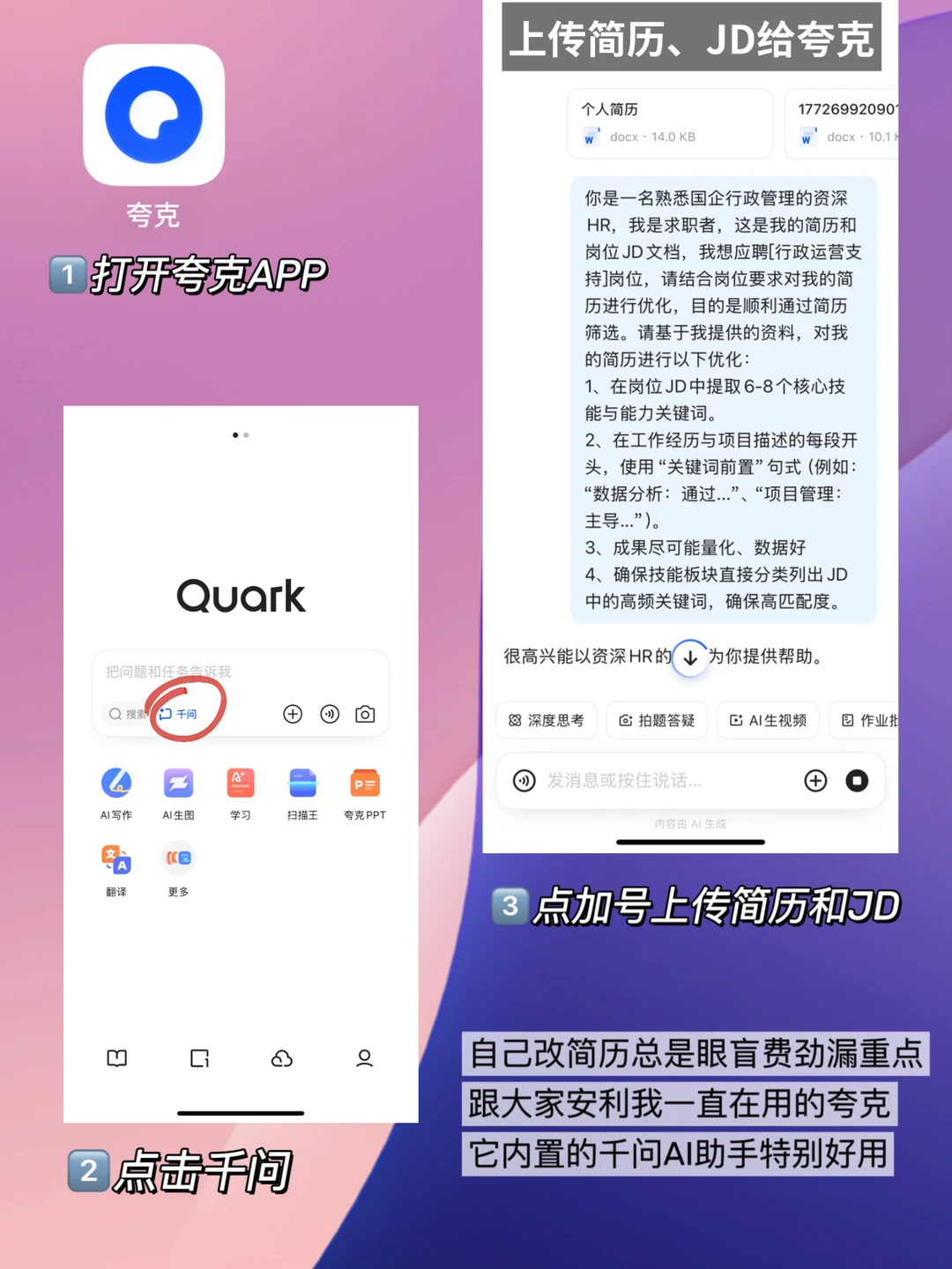 但自己改简历眼盲费劲漏重点,跟大家安利我一直在用的夸克,它内置了千问AI助手,回答很聪明。上传简历和岗位JD后输入指令(详见图)一会就能给出水准更高的精华版能帮分析岗位核心能力,判断你适不适合投递。还能顺便输入岗位搜海量简历模板,换上单位官网适配风格,用夸克扫描王拍简历证件照一站式搞定。简历改得好,面试成了一半。