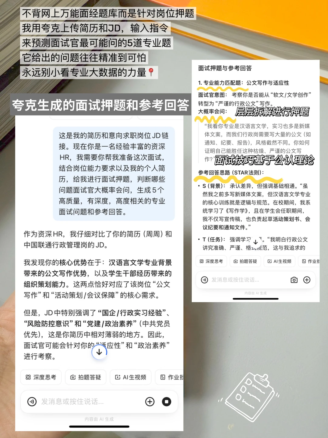 ✓押题要准。不背网上万能面经题库,而是针对岗位押题。在夸克上传简历和JD,输入指令(图3)预测最可能问的5道题,它给的问题精准还有参考回答,别小看大数据。