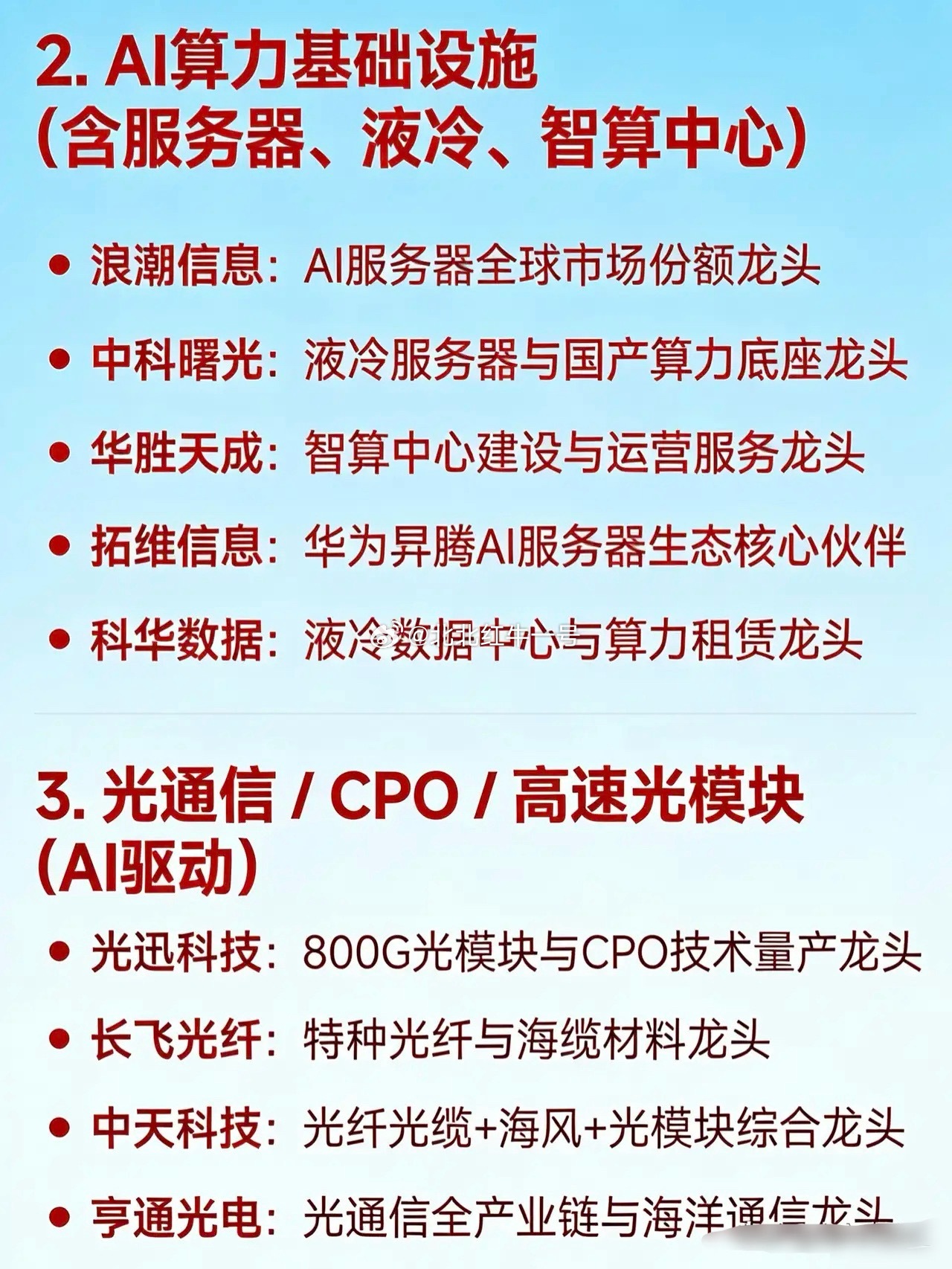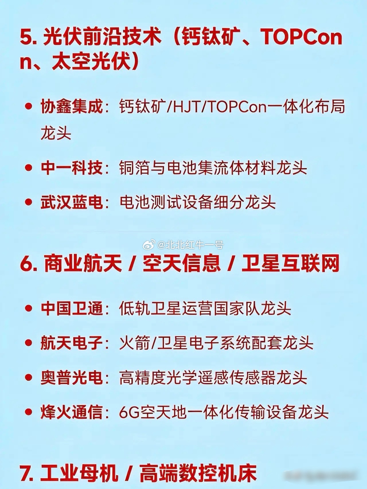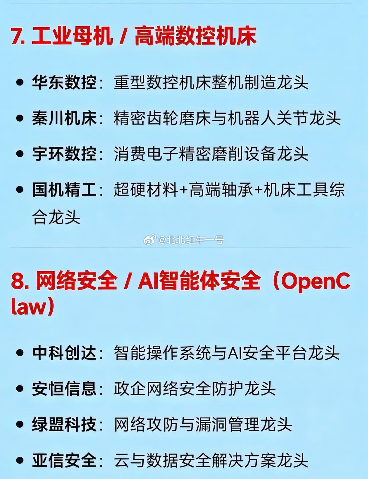 2026年3月11日十大热点科技及核心龙头1. 储能(含大储、户储、新型储能)阳光电源:全球光伏逆变器与储能系统领军企业派能科技:户用储能电池出口佼佼者首航新能:储能逆变器与电池包一体化先锋德业股份:户储逆变器海外渠道引领者锦浪科技:组串式逆变器与储能解决方案翘楚正泰电源:工商业及户用光储系统龙头企业鹏辉能源:储能电芯与系统集成先锋2. AI算力基础设施(含服务器、液冷、智算中心)浪潮信息:AI服务器全球市场份额领先者中科曙光:液冷服务器与国产算力底座领军者华胜天成:智算中心建设与运营服务先锋拓维信息:华为昇腾AI服务器生态核心伙伴科华数据:液冷数据中心与算力租赁龙头3. 光通信 / CPO / 高速光模块(AI驱动)光迅科技:800G光模块与CPO技术量产先锋长飞光纤:特种光纤与海缆材料领军者中天科技:光纤光缆+海风+光模块综合龙头亨通光电:光通信全产业链与海洋通信翘楚4. 存储芯片 / 内存短缺 / 国产替代兆易创新:NOR Flash全球龙头,DRAM自研突破者佰维存储:存储模组与先进封测先锋雅克科技:半导体前驱体与存储材料领军者5. 光伏前沿技术(钙钛矿、TOPCon、太空光伏)协鑫集成:钙钛矿/HJT/TOPCon一体化布局先锋中一科技:铜箔与电池集流体材料领军者武汉蓝电:电池测试设备细分龙头6. 商业航天 / 空天信息 / 卫星互联网中国卫通:低轨卫星运营国家队领军者航天电子:火箭/卫星电子系统配套先锋奥普光电:高精度光学遥感传感器翘楚烽火通信:6G空天地一体化传输设备龙头7. 工业母机 / 高端数控机床华东数控:重型数控机床整机制造领军者秦川机床:精密齿轮磨床与机器人关节先锋宇环数控:消费电子精密磨削设备翘楚国机精工:超硬材料+高端轴承+机床工具综合龙头8. 网络安全 / AI智能体安全(OpenClaw)中科创达:智能操作系统与AI安全平台领军者安恒信息:政企网络安全防护先锋绿盟科技:网络攻防与漏洞管理翘楚亚信安全:云与数据安全解决方案龙头9. 固态电池 / 锂电新材料天齐锂业:锂资源+低成本提锂先锋宁德时代:动力电池与固态电池研发领军者亿纬锂能:大圆柱电池与储能电芯翘楚欣旺达:消费+动力+储能全场景电池龙头10. 数据要素 / 行业高质量数据集 / AIDC光环新网:一线城市IDC资源与云计算领军者奥飞数据:粤港澳大湾区AIDC建设先锋云赛智联:城市级数据治理与腾讯生态合作翘楚石基信息:酒店/零售行业数据+小程序AI赋能龙头