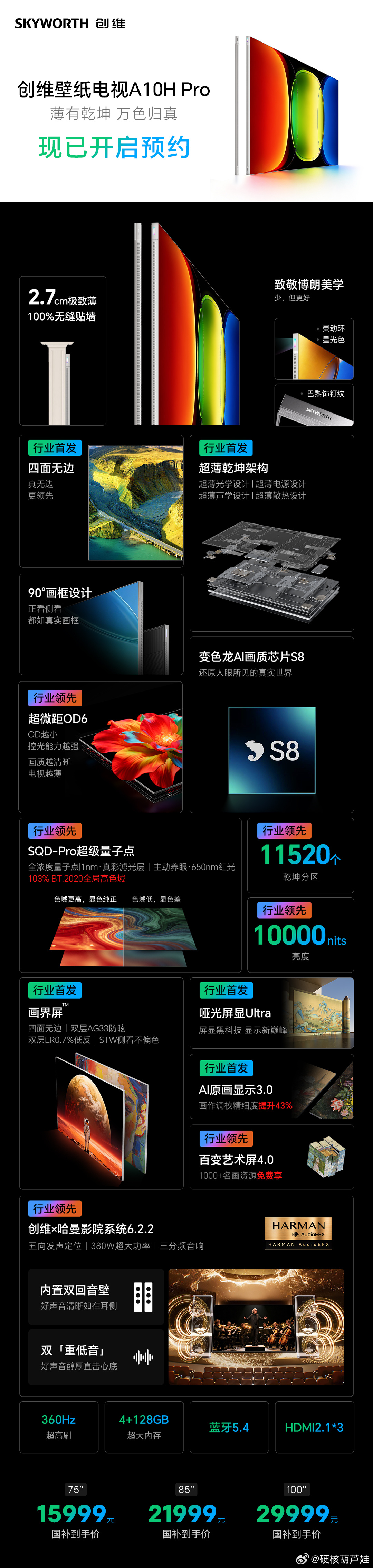 创维壁纸电视新品发布创维壁纸电视A10H系列薄有乾坤万色归真迄今为止最薄超旗舰薄至27.9mm!行业首发四面无边!418超薄&散热专利行业唯一兼具薄与高画质的超旗舰标杆!现已开启全网预约!电视界的苹果来了创维壁纸电视A8H颜值音画三旗舰!火热预售中,3月12日晚8点全网开售!
