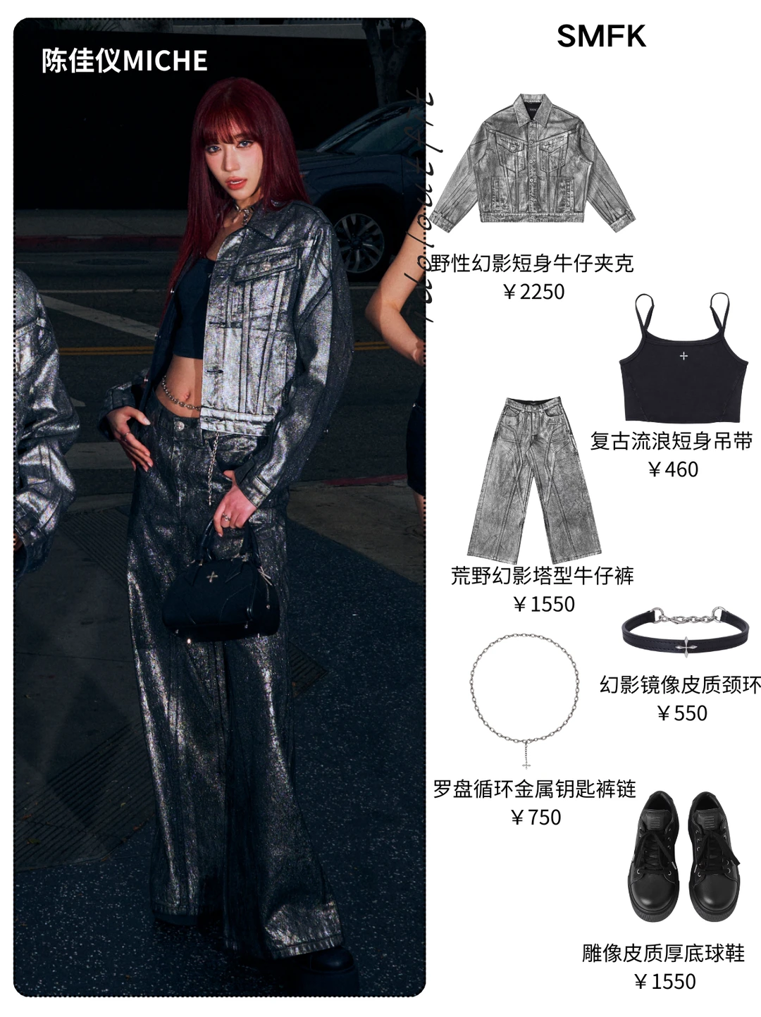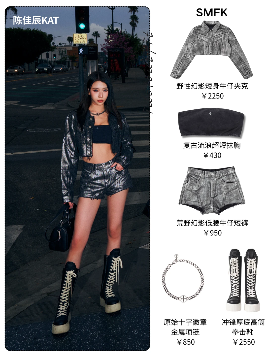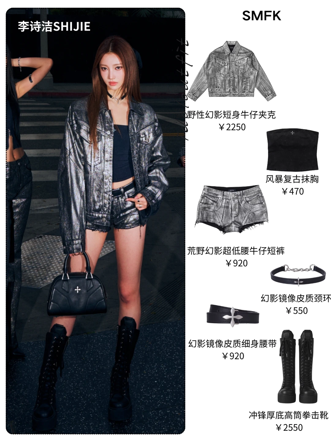 朱晨予的高领背心+亮面喇叭裤,利落又显腿长,金属十字项链点睛,甜酷感拉满💥 李诗洁/陈佳仪/陈佳辰的短款牛仔夹克+短裤,露腰设计+厚底靴,气场全开 曲唱的吊带+短裙+过膝靴,甜辣平衡得刚刚好,金属裤链细节超加分 整套以银黑做旧牛仔+十字金属配饰为核心,又A又飒,出片率100%!既有美式街头的随性,又有SMFK标志性的暗黑十字元素,品牌“高反差、无性别、包容性”的设计哲学,与A2O MAY的个性女团气场高度契合,运动、牛仔、工装的核心品类混搭,让造型兼具街头感与高级感,太适合舞台和出街了!