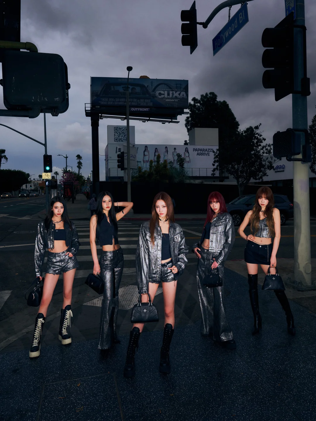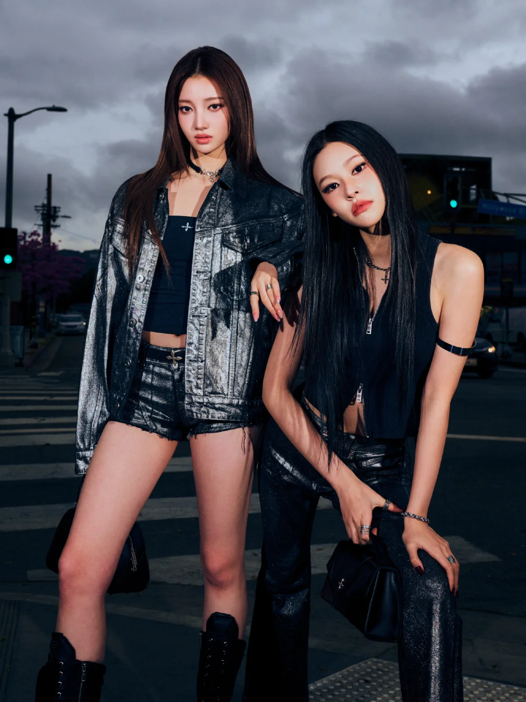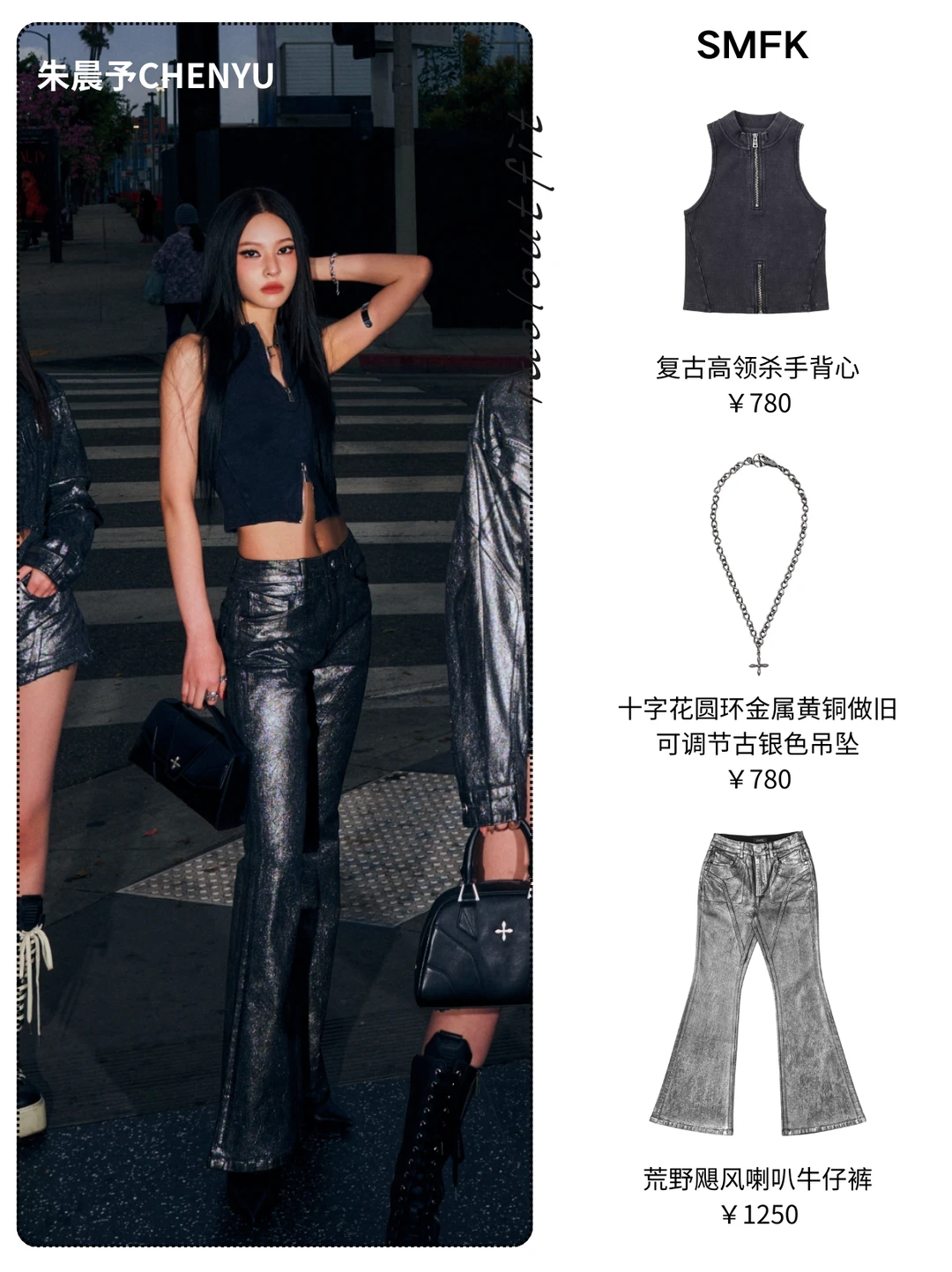 朱晨予的高领背心+亮面喇叭裤,利落又显腿长,金属十字项链点睛,甜酷感拉满💥 李诗洁/陈佳仪/陈佳辰的短款牛仔夹克+短裤,露腰设计+厚底靴,气场全开 曲唱的吊带+短裙+过膝靴,甜辣平衡得刚刚好,金属裤链细节超加分 整套以银黑做旧牛仔+十字金属配饰为核心,又A又飒,出片率100%!既有美式街头的随性,又有SMFK标志性的暗黑十字元素,品牌“高反差、无性别、包容性”的设计哲学,与A2O MAY的个性女团气场高度契合,运动、牛仔、工装的核心品类混搭,让造型兼具街头感与高级感,太适合舞台和出街了!