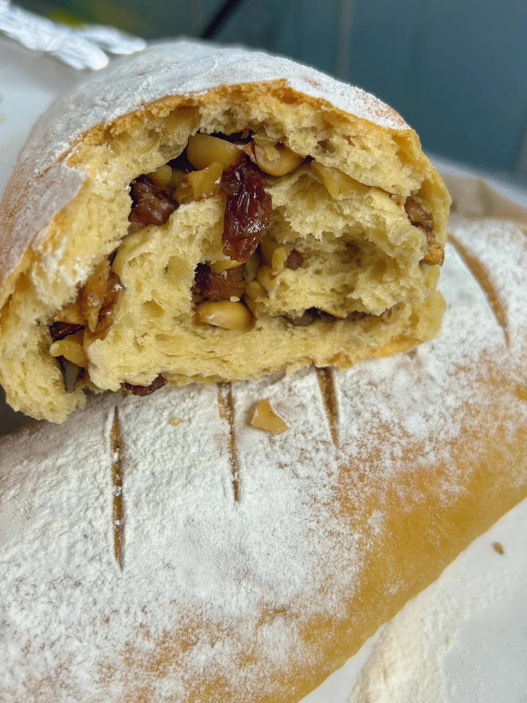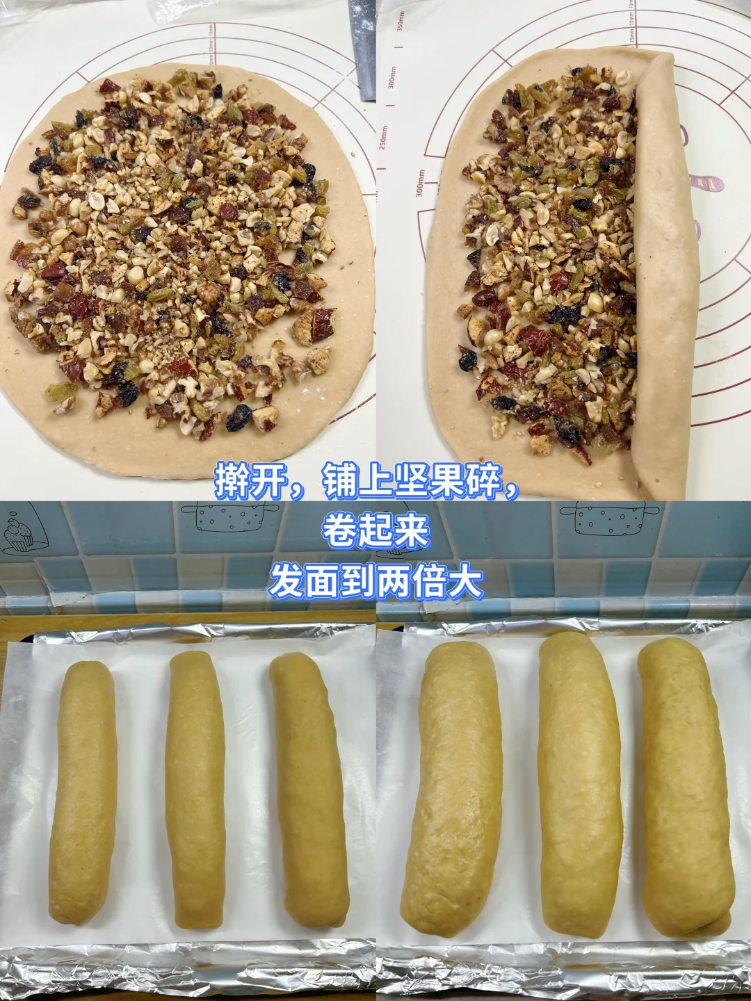 4. 取一个松弛好的面团,擀成长方形,撒上坚果碎,卷起来。35℃左右进行二次发至1.5倍大。