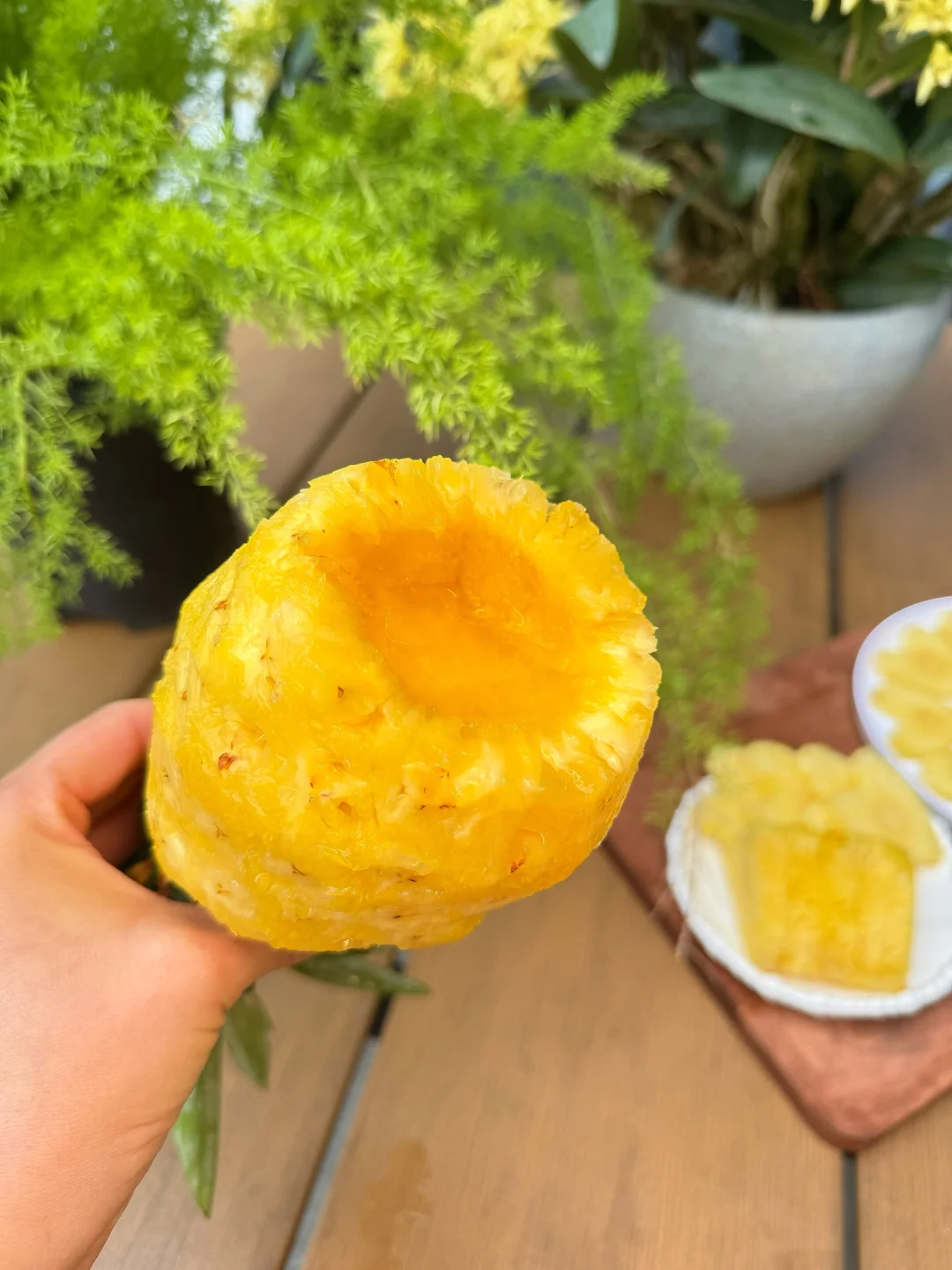 把热带阳光握在手里 刚切的金钻凤梨带着清新果香 金黄果肉泛着水润光泽,咬一口爆汁清甜 挖空的果芯像个小小的宝藏杯,装果汁/酸奶随心配. 一口果肉一口料,连容器都能啃得干干净净, 懒人吃货的快乐,这颗凤梨全给你承包了!