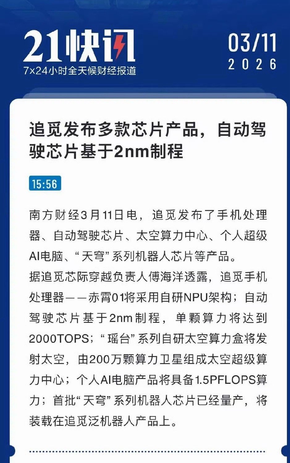 追觅手机处理器——赤霄01将采用自研NPU架构;自动驾驶芯片基于2nm制程,单颗算力将达到2000TOPS;“瑶台”系列自研太空算力盒将发射太空,由200万颗算力卫星组成太空超级算力中心;个人AI电脑产品将具备1.5PFLOPS算力;首批“天穹”系列机器人芯片已经量产,将装载在追觅泛机器人产品上。