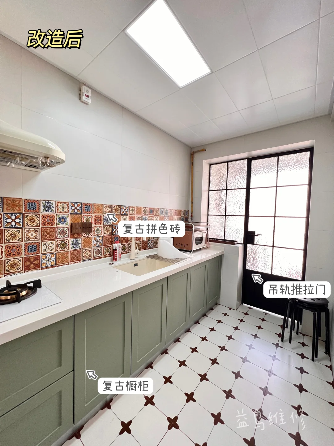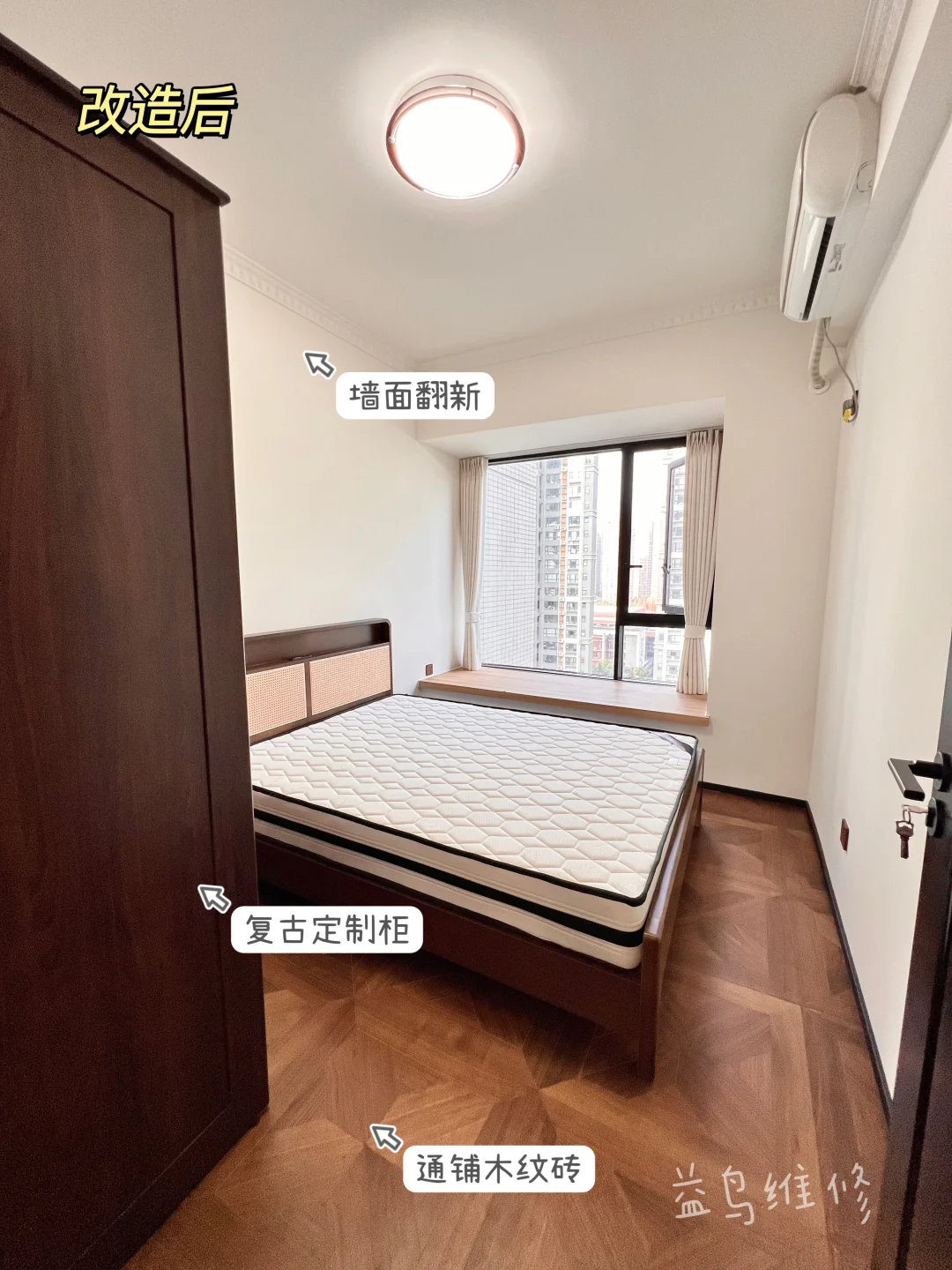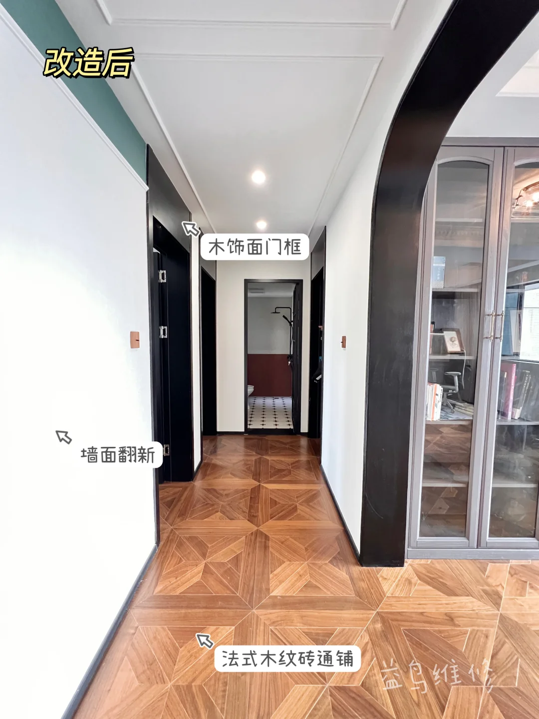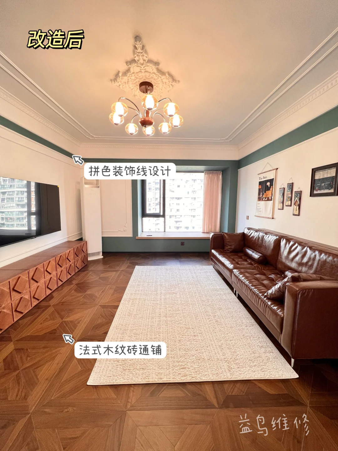 ▪️ 全屋地面升级 改造前:全屋通铺老旧瓷砖,满是斑驳脏污,显旧又压抑; 改造后:客厅到卧室通铺木地板,温柔的木质感贯穿全屋,脚感和颜值双在线;厨卫地面搭配复古小花砖,细节感拉满,不单调又好打理