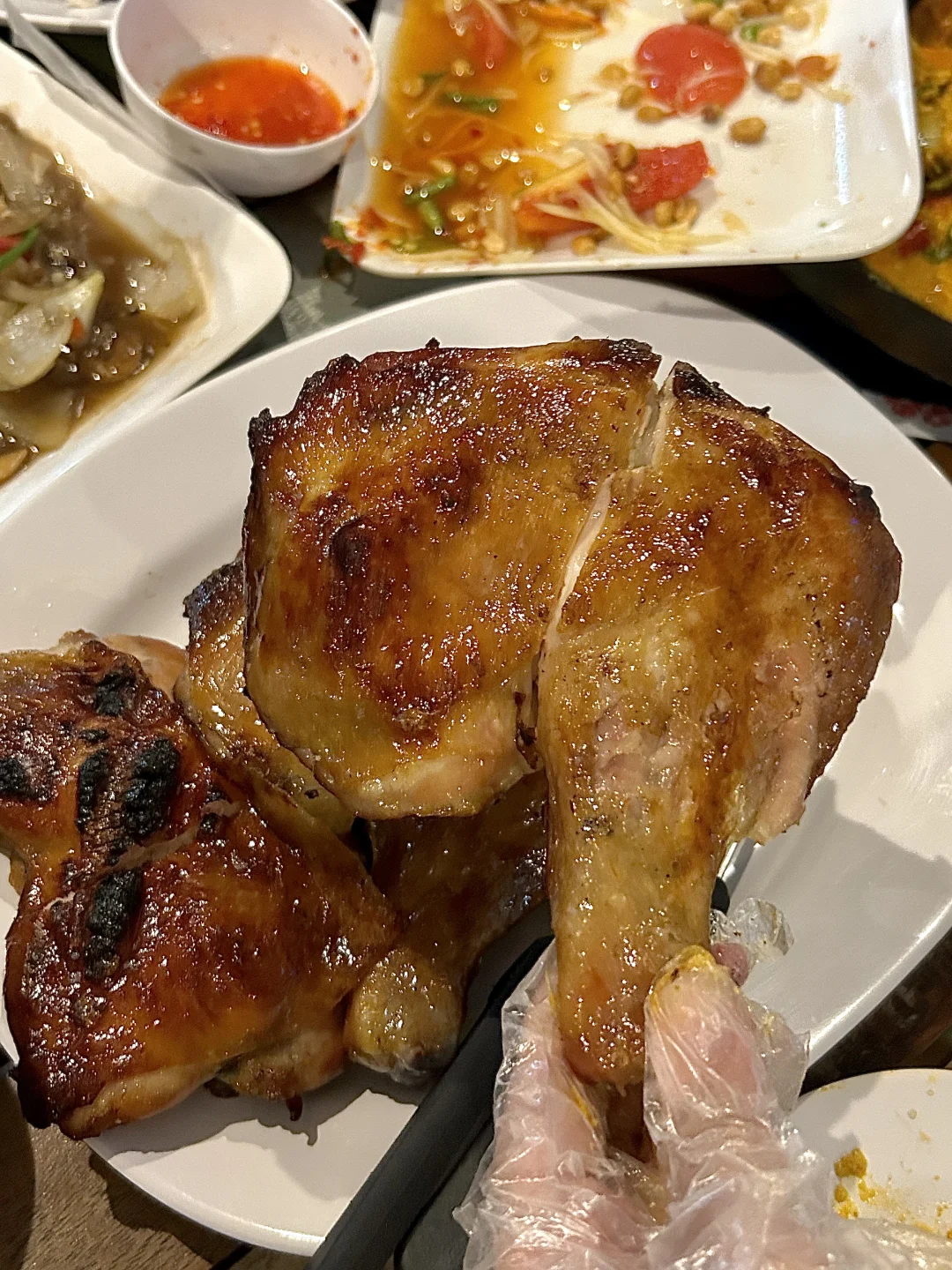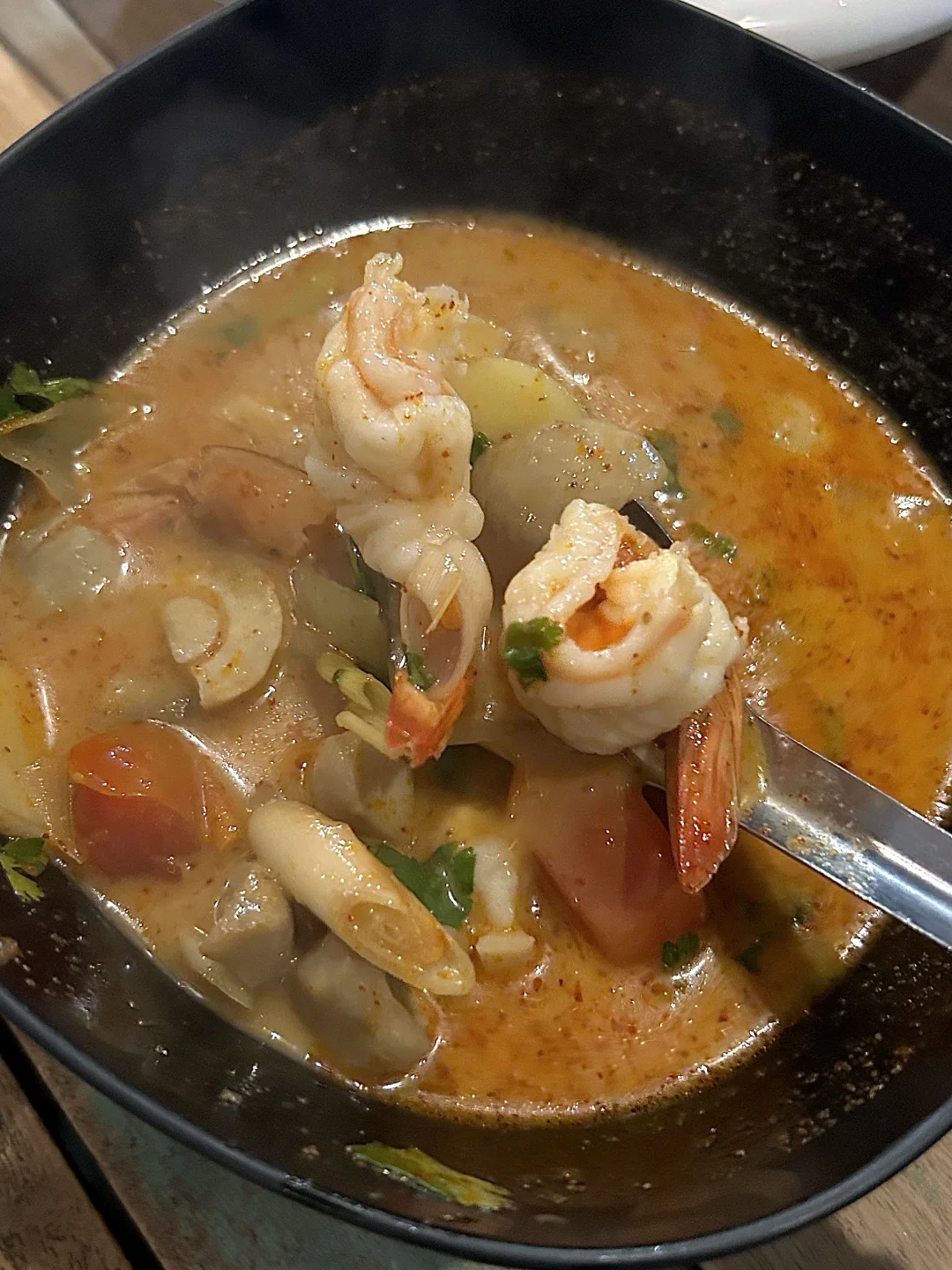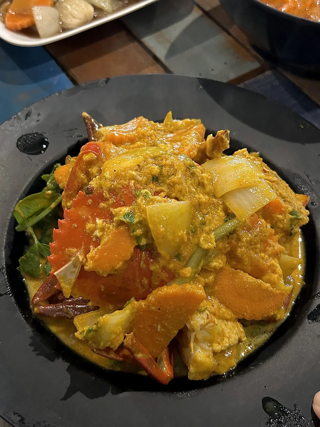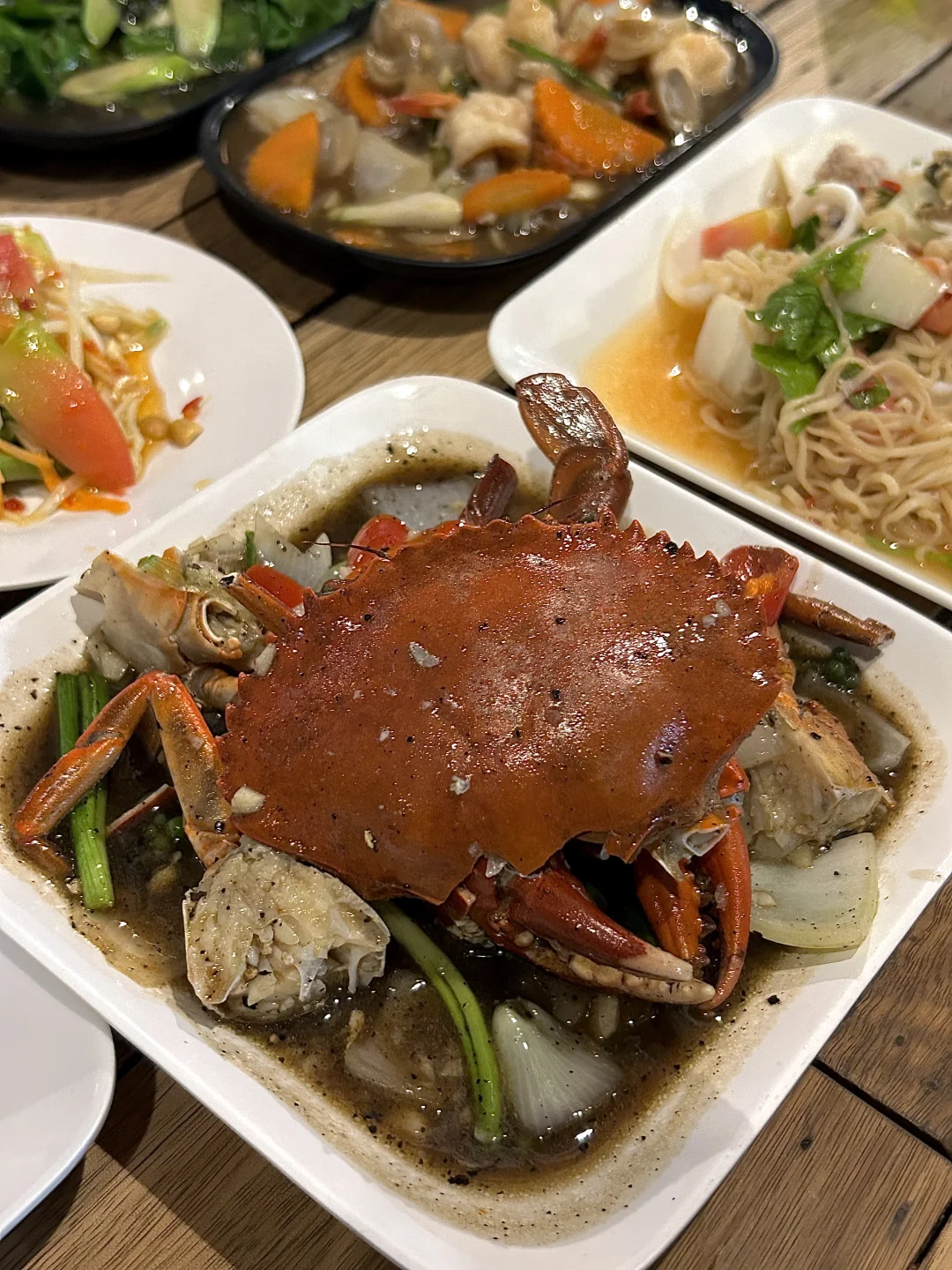 淡季的普吉岛真的太香了!人不多好舒服☺️ 就是遇上雨季,时而雨🌧️时而晴🌞 青木瓜沙拉很开胃! 咖喱蟹和炒蟹🦀️也很香~推荐!! 印象最深刻的是那个烤虾🦐和烤鸡腿,烤过的虾表皮微微焦但是更鲜了,烤过的鸡腿🍗超嫩!! 地点很好找,就在芭东海滩附近🏝️