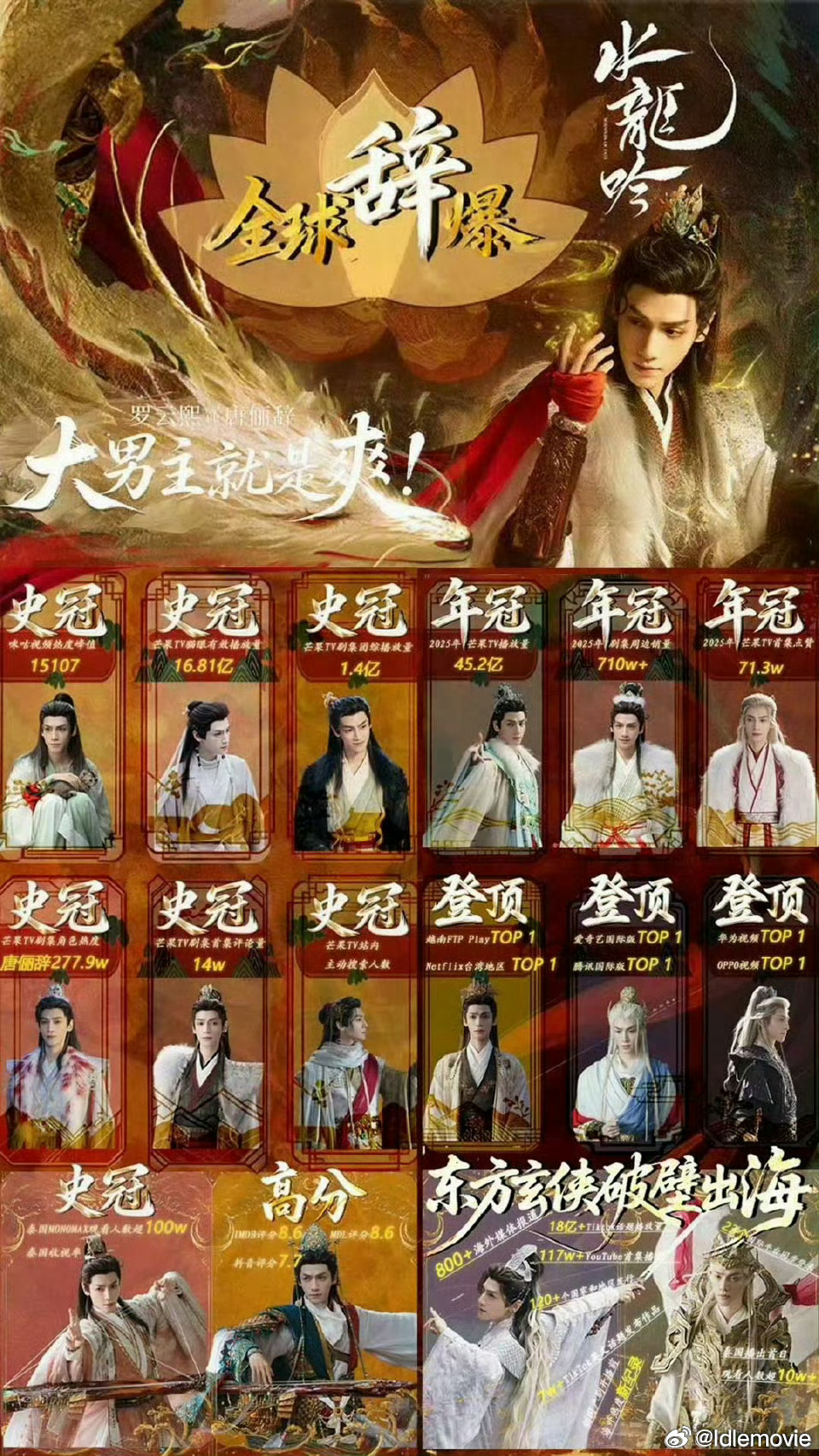 《水龙吟》更是芒果年冠,全球辞爆,在120多个国家和地区发行,多国登顶,被央视称为中国流行文化IP开启全球之旅,当之无愧的中国文化符号,相关周边销售真金白银破千万,团综、艺术展、剧集演唱会也同样大获成功创纪录,罗云熙的扛剧能力,商业价值可见一斑。