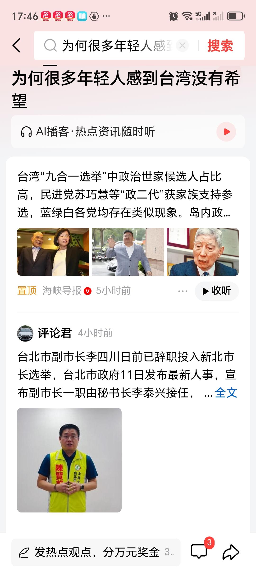 为何很多年轻人感到台湾没有希望 很多年轻人觉得台湾没希望,从政治层面看,台湾政坛被政治世家把持。“九合一选举”里,蓝绿白各党候选人不少出身政治家族,像民进党苏巧慧、国民党蒋万安等。这些“政N代”有人脉、财力,普通年轻人难与之竞争,从政之路被堵。 从两岸关系上,台当局一些人顽固“谋独”,但解放军实力强大,武统压力让他们害怕;可他们又拒绝和统。大陆海警船常态化巡航,逐步抹去所谓“禁限制水域”概念,彰显“一个中国”原则。这种紧张局势下,台湾年轻人看不到和平稳定发展的未来,自然觉得没希望。